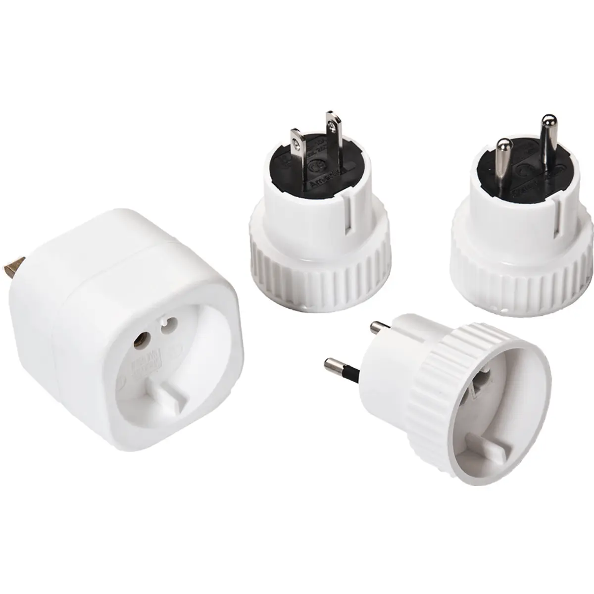 Kit de adaptadores de viagem universal com quatro fichas BE/DE/NL/RU (Schuko tipo F), UK/HK (BS 1363 tipo G) e EUA/CA/CN (NEMA 1-15 tipo A). Cor branca, material plástico.