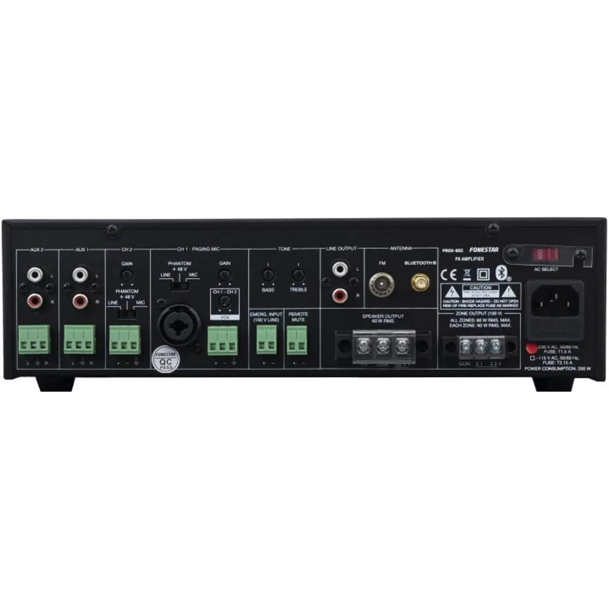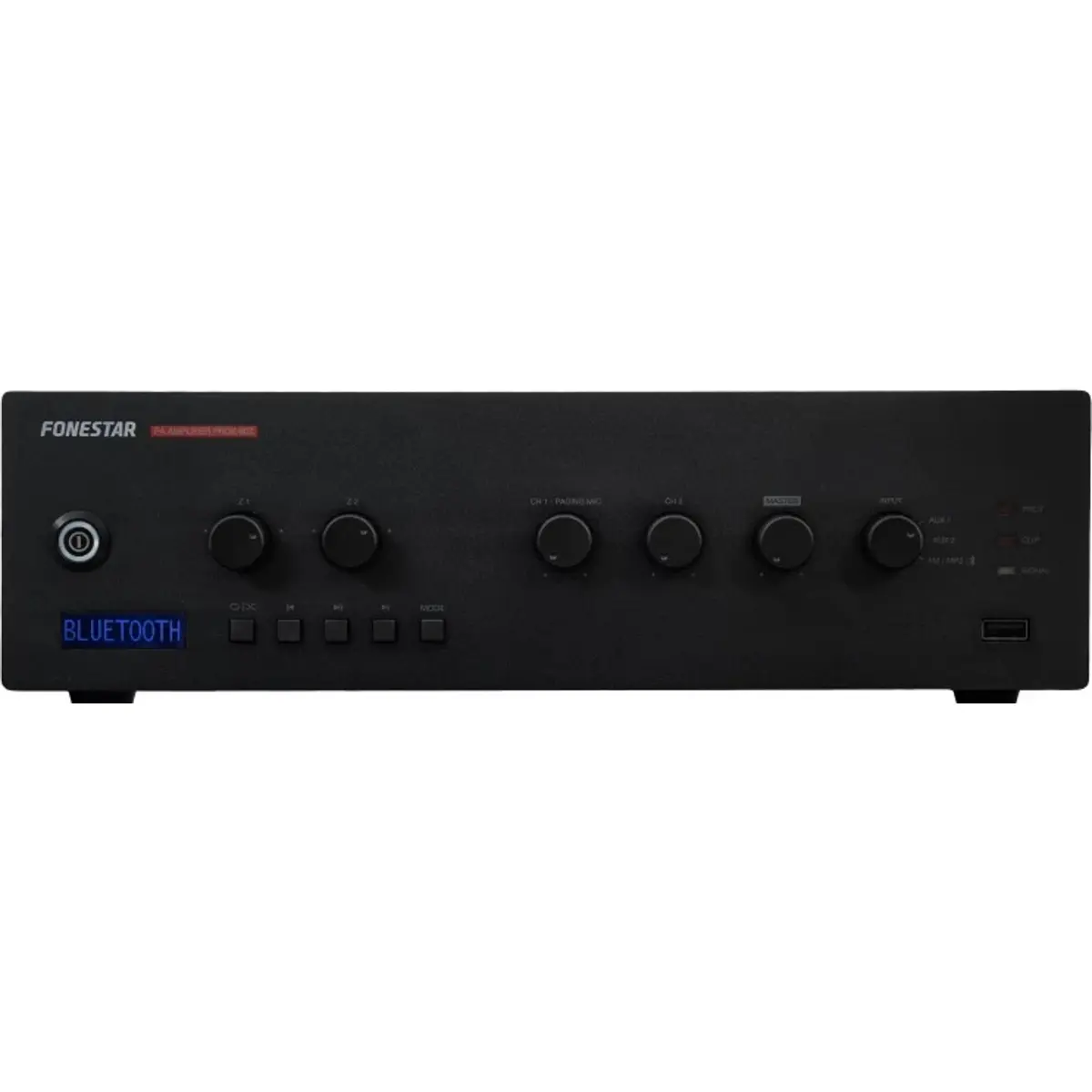 Amplificador de megafonia com reprodutor Bluetooth®/USB/FM e seletor de zonas de colunas.