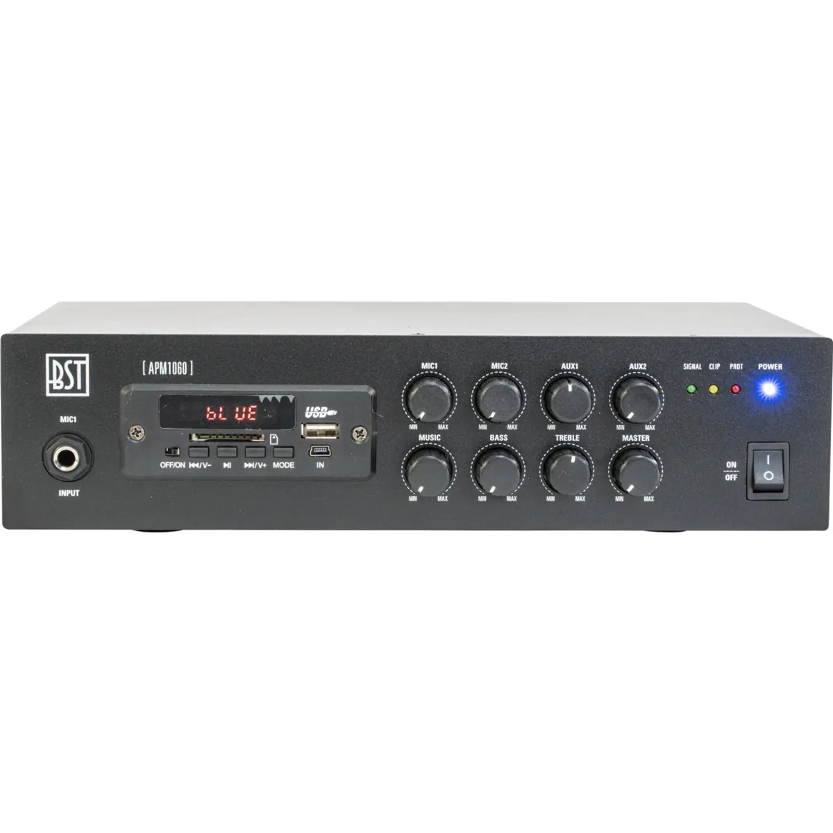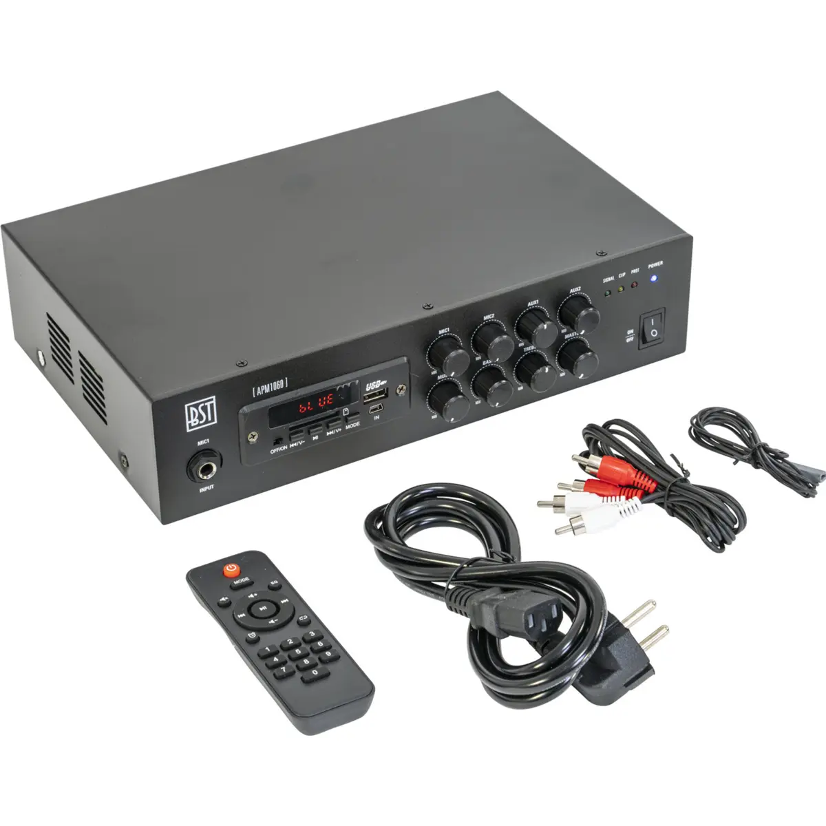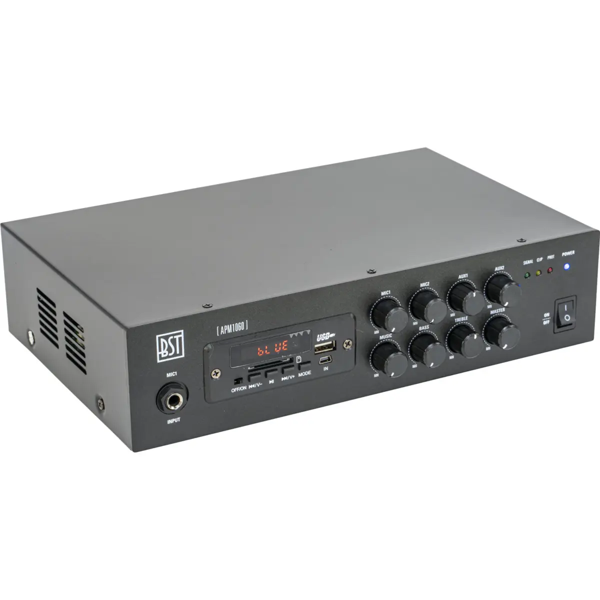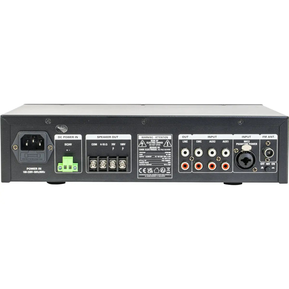 Este misturador-amplificador é a solução perfeita para pequenas instalações de PA, oferecendo um leitor USB, SD, Bluetooth e sintonizador FM numa caixa compacta.