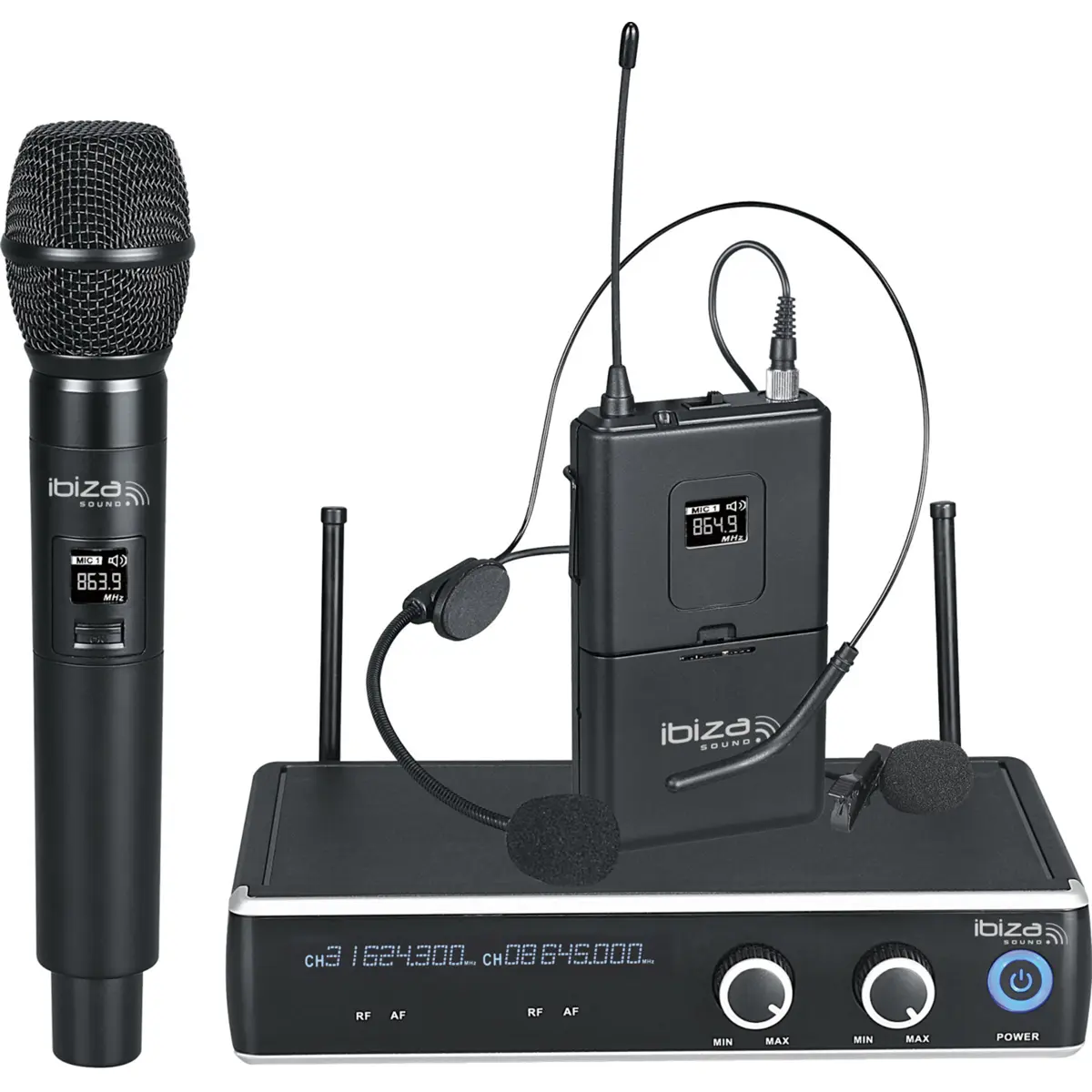 · Sistema de microfones sem fios com recetor, um microfone de mão, um de lapela e um headset.