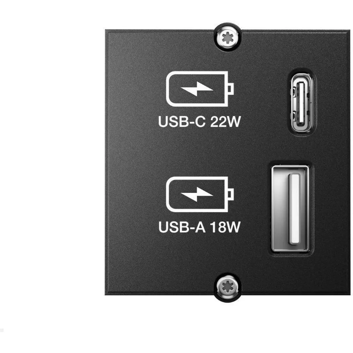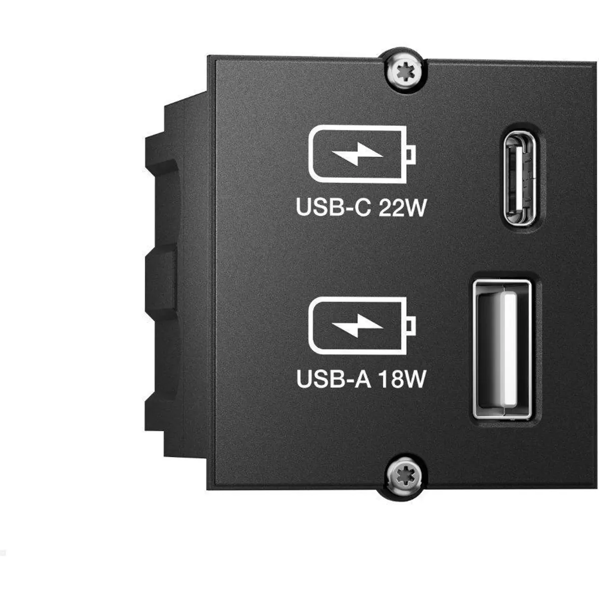 Este módulo "custom" da Bachmann combina uma tomada USB-C de 22 W com uma tomada USB-A de 18 W num design compacto e eficiente. Ideal para carregar smartphones, tablets e outros dispositivos, é compatível com tecnologia de carregamento rápido PD e QC. A instalação é simples, sendo compatível com diversos sistemas da marca, como o CONI, POWER FRAME e DESK.