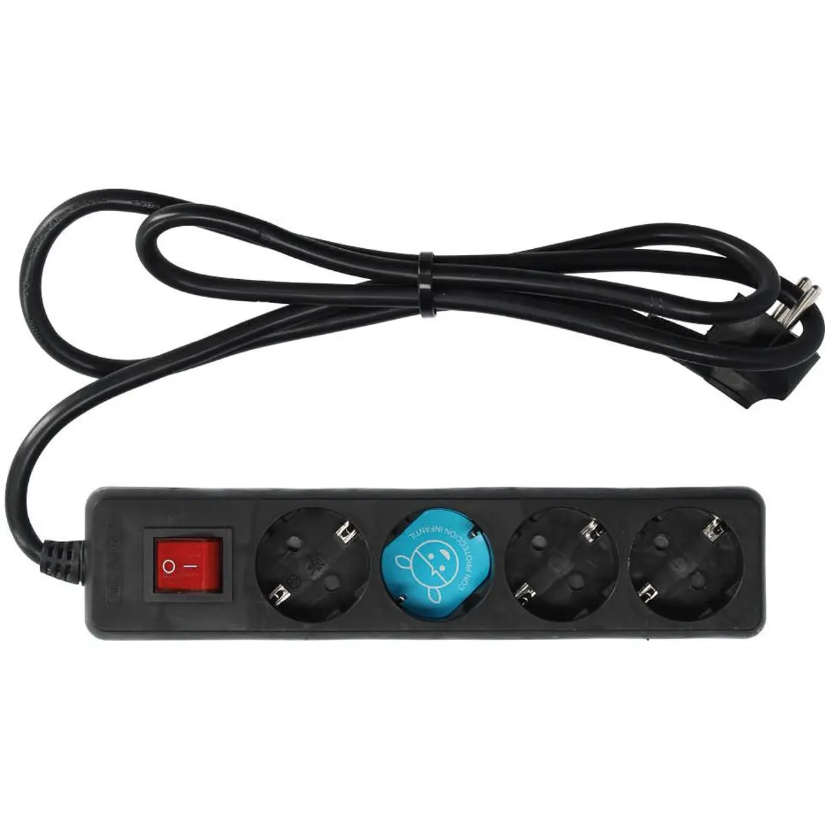 Bloco de tomadas com quatro tomadas Schuko, interruptor e acabamento preto, indicado para uso interior. Possui cabo elétrico H05VV-F de 3 metros e seção 3x1.5mm, oferecendo potência máxima de 3680W. Ideal para ligar vários dispositivos ao mesmo tempo, com comutação através do interruptor para maior controlo. Compacto e prático para casa, escritório ou ambiente de estudo, assegura organização de cabos e acessibilidade com uma solução de alimentação segura.