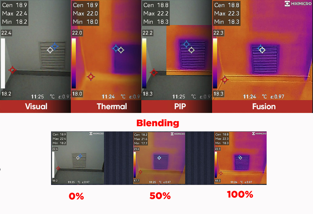 - Cinco modos de imagem: Térmico, Visual, Fusão, Mistura e Imagem na Imagem