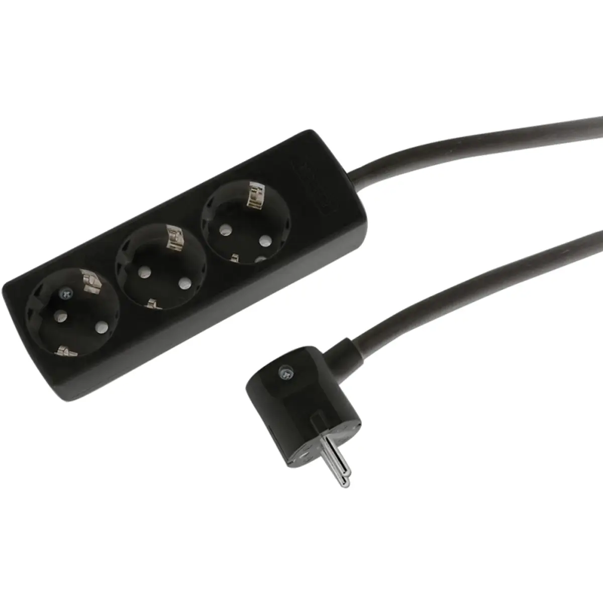 Bloco de 3 tomadas com cabo de 3x2.5mm² e extensão de 3 m, na cor preta, adequado para uso doméstico e comercial. Suporta até 250 V e 16 A, com normas IEC 60884-1 e DIN 49440-1, terminais em CuZn36, CuZn37 e CuZn39, bloco em Poliamida 6, oferecendo isolamento e durabilidade. Opera entre -5 °C e +40 °C, com máximo de 35 °C em 24 horas. Classe de Proteção P20.