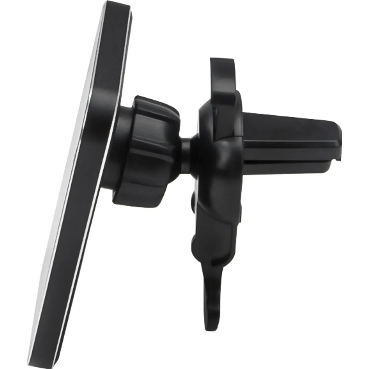 Suporte para carro com carregamento sem fios de 15W via MagSafe, com fixação magnética que mantém o telemóvel estável durante a condução. Compatível com telemóveis que suportam carregamento sem fios Qi, funciona com vários modelos sem depender de marca específica. Possui sistema anti-desprendimento para manter o dispositivo seguro nas saídas de ar mesmo em condução dinâmica. Ideal para quem procura carregamento rápido e fixação segura em viagem, sem comprometer a ergonomia do veículo.