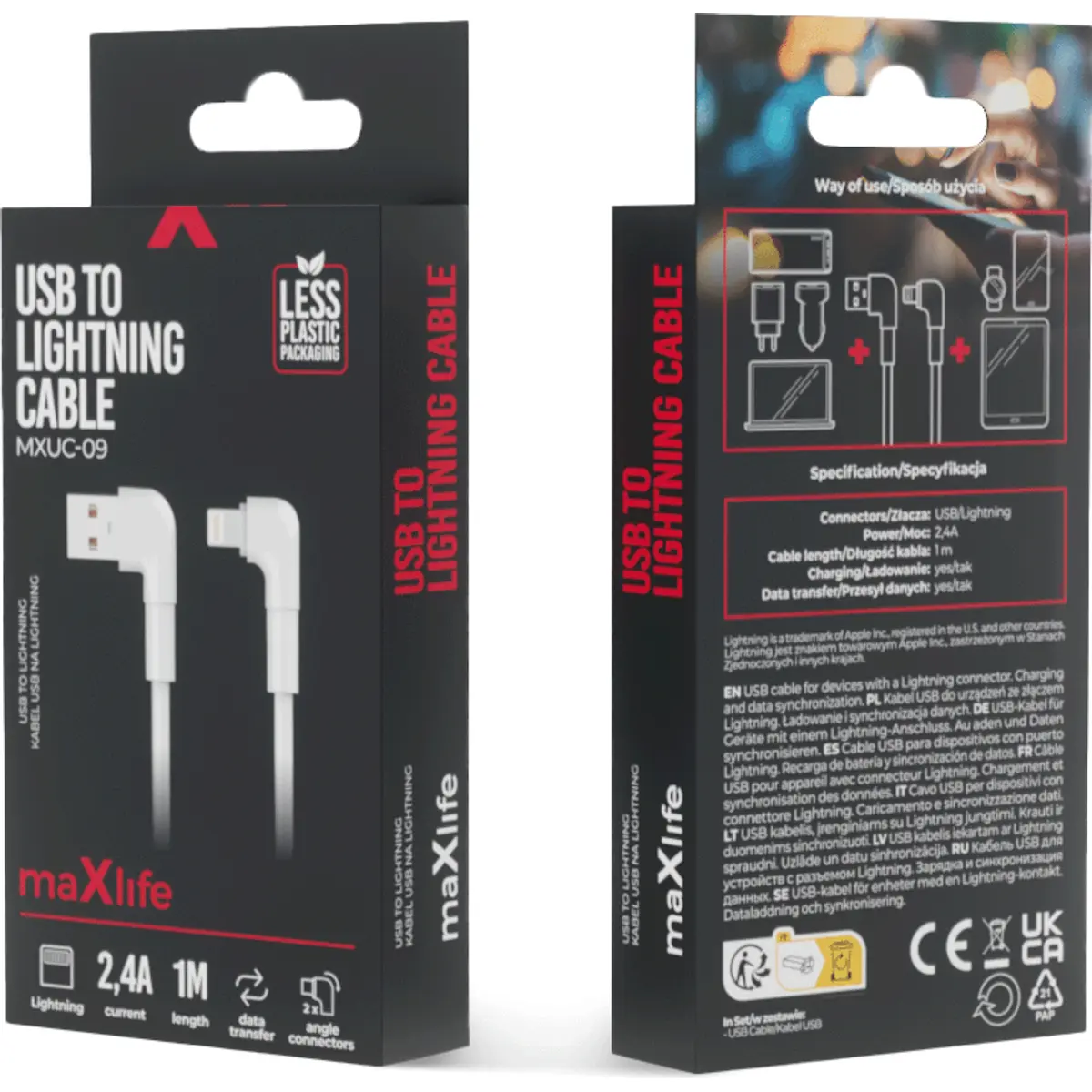 Maxlife MXUC-09 - Cabo de dados e carregamento 2.4A USB-A -> Lightning - c/ fichas 90º - 1.0m - branco