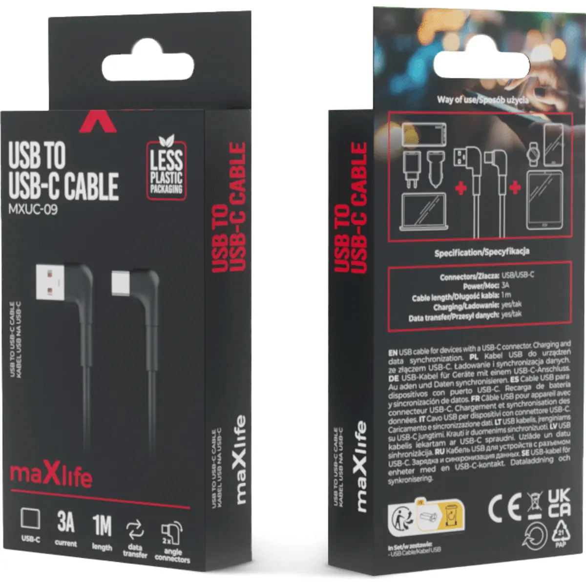 Maxlife MXUC-09 - Cabo USB-A -> USB-C 3A - c/ fichas 90º - 1.0m - preto