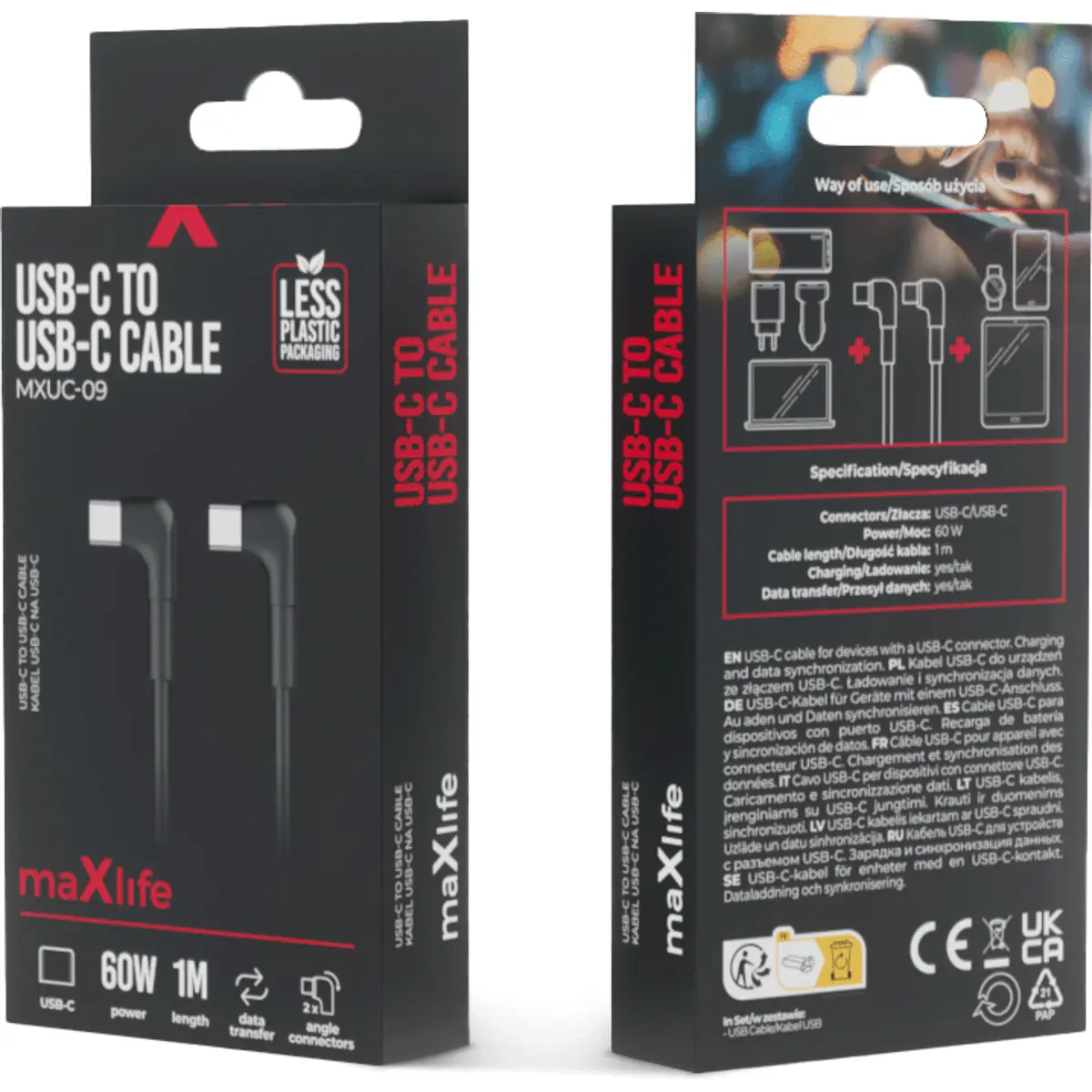 Maxlife MXUC-09 - Cabo USB-C -> USB-C 60W - c/ fichas 90º - 1.0m - preto