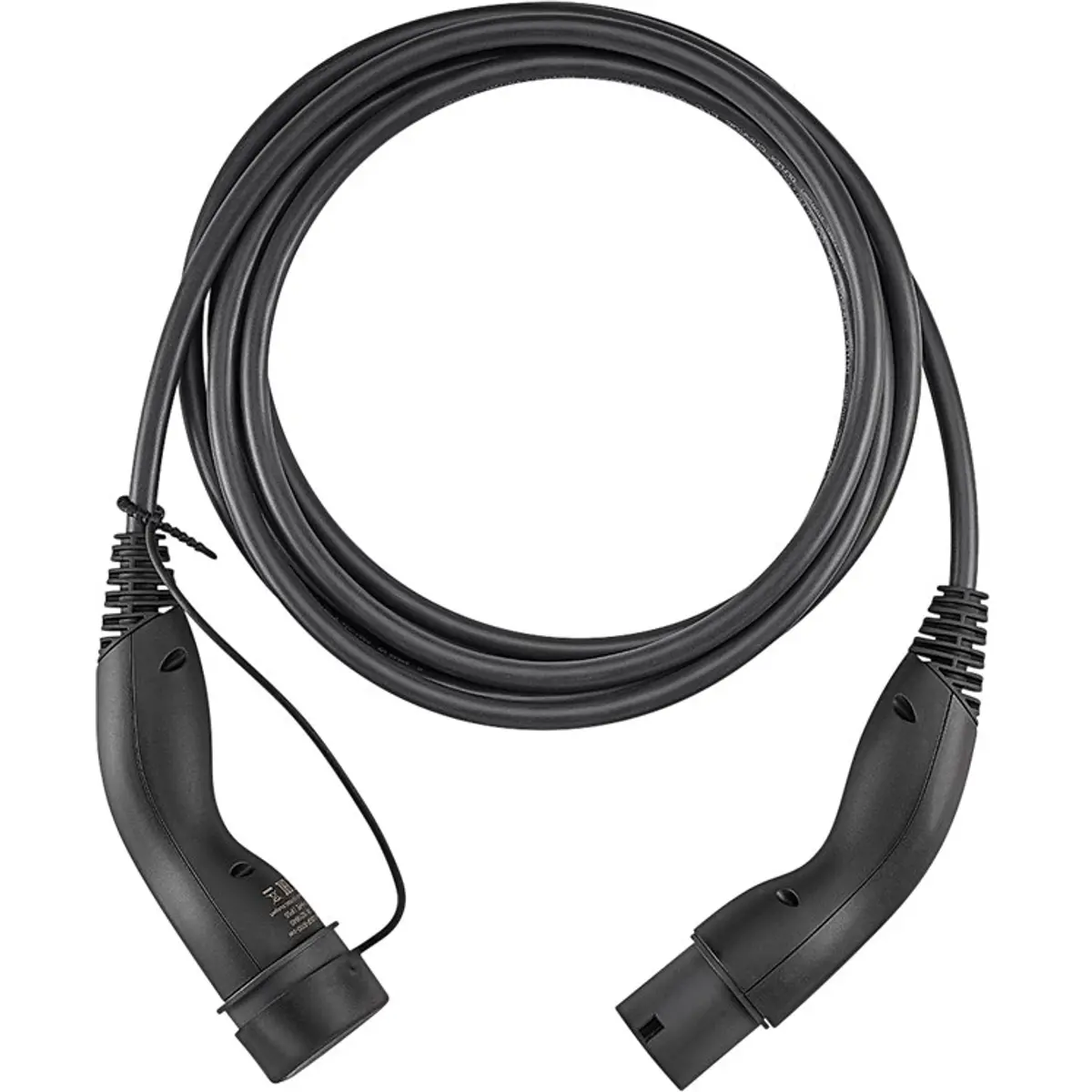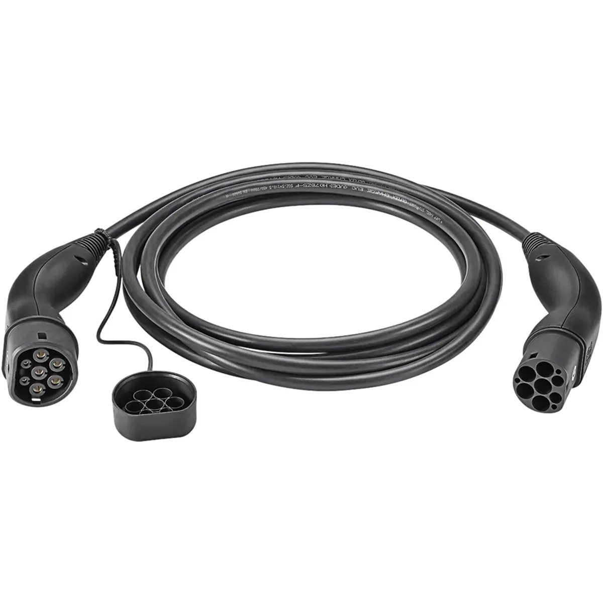 Cabo trifásico para carregamento de automóveis elétricos, com 5m de comprimento, fichas de ligação do Tipo 2, corrente máxima de 32A (por fase) e potência máxima de 22kW.