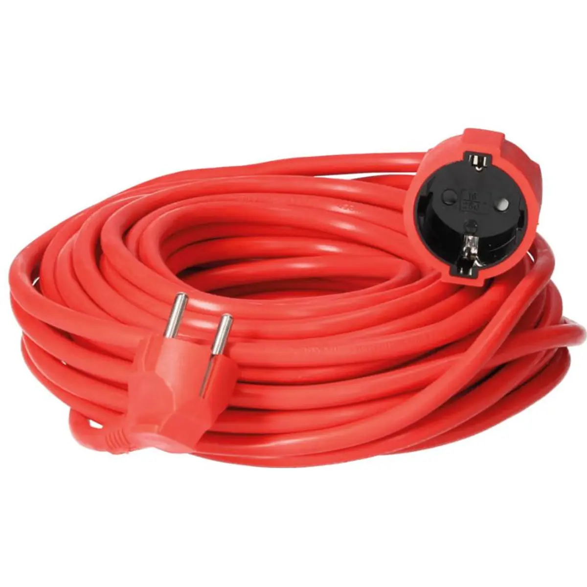 Extensão Schuko de 10 m vermelha com cabo H05VV-F, secção 3x1.5mm, 250V, 10/16A, tomada 2P+TT e potência máxima de 3680W. Proteção para crianças incluída, oferecendo fiabilidade para ligações elétricas seguras.