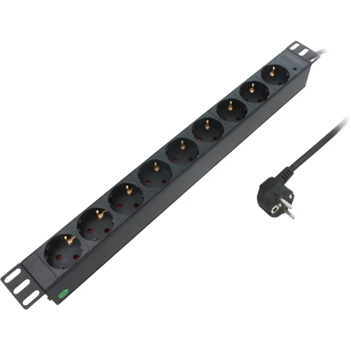 Bloco de distribuição de energia para rack 19'' em formato 1U com indicador LED. Fornece 9 tomadas do tipo alemão (Schuko) para alimentação de equipamentos de rede e servidor, suportando até 250 VAC e 16 A. Inclui cabo de alimentação de 2 m com ficha CEE7/7. A carcaça em liga de alumínio oferece resistência e leveza, em acabamento preto RAL 9005. Ideal para armários, racks e salas de servidores, garantindo organização e proteção elétrica.