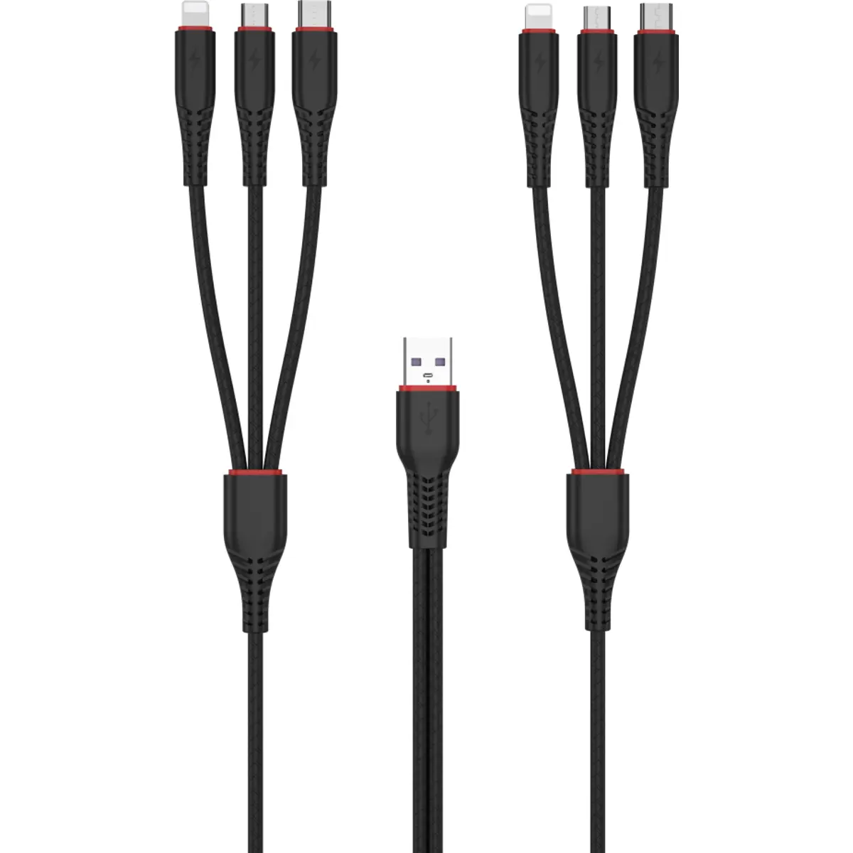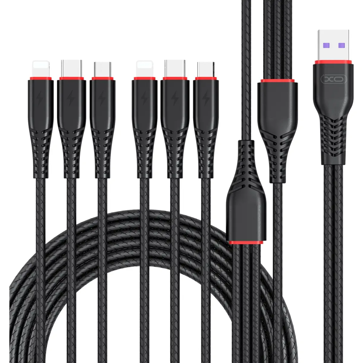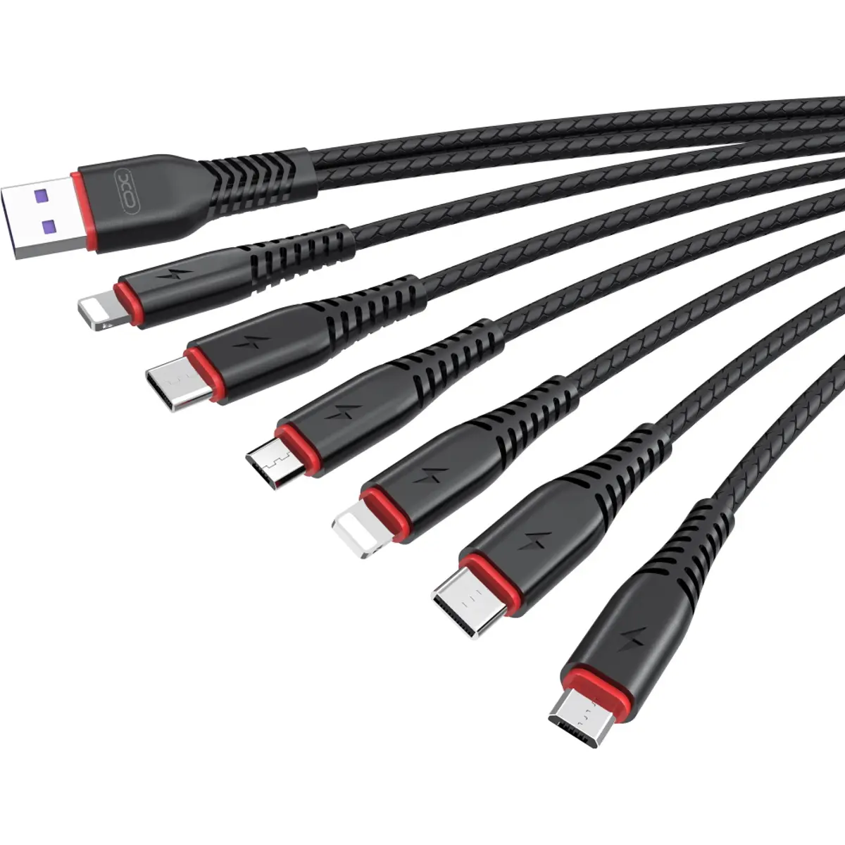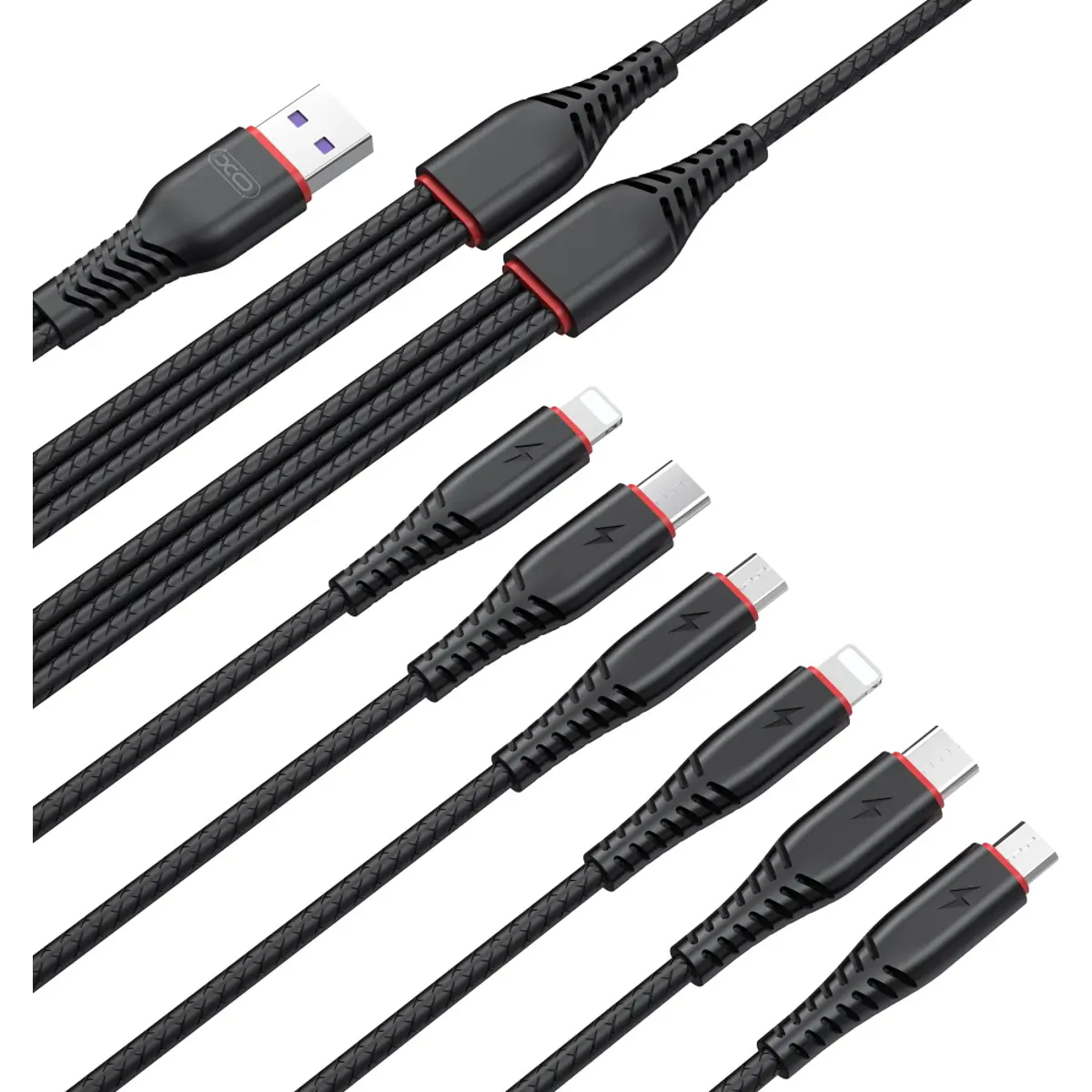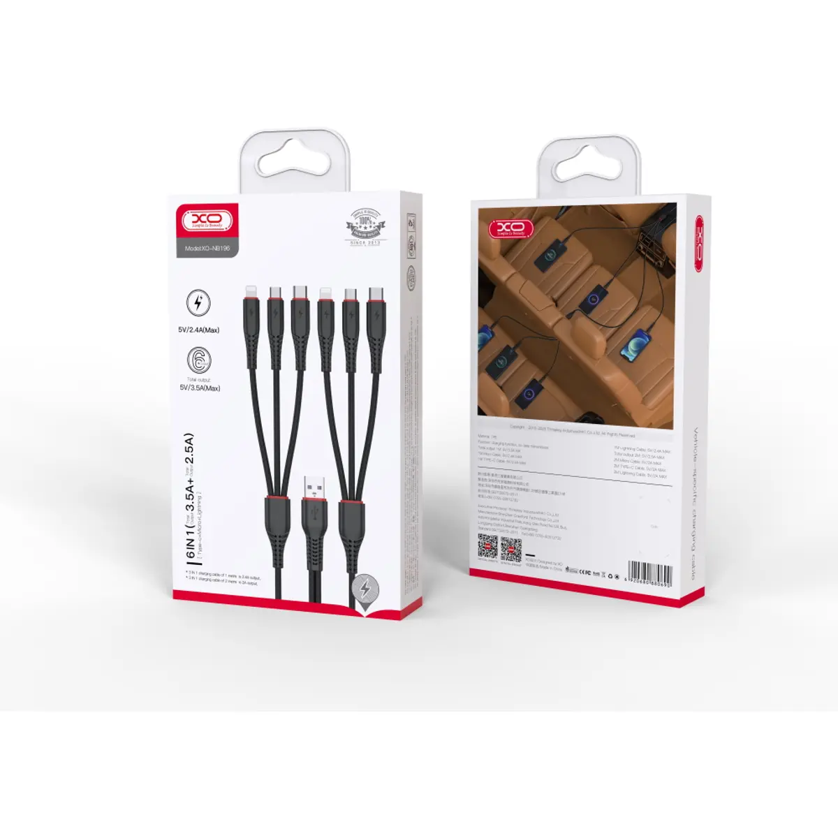 O XO NB196 é um cabo 6-em-1 equipado com uma ficha USB-A ligada a dois cabos com 3 fichas cada: um é de 1.2m e ou outro é de 2m; cada um deles possui um conector Lightning, um microUSB e um USB-C.