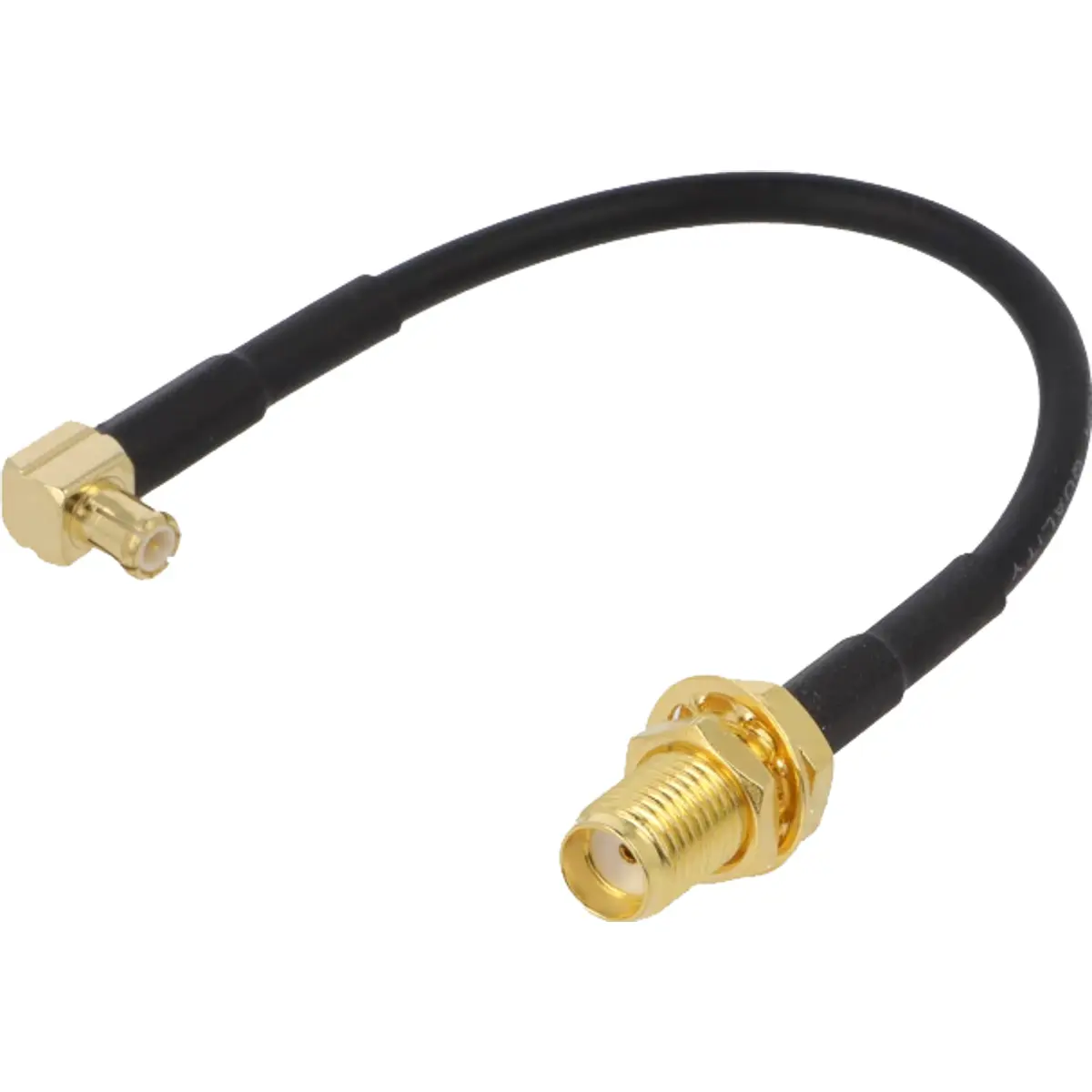 Adaptador de cabo coaxial RG174 com conectores SMA fêmea e MCX macho de 90 graus, comprimento de 0,1 m. Ideal para ligações RF entre componentes com estes conectores, proporcionando montagem compacta e facilidade de integração em hardware de RF, incluindo protótipos e setups de teste.