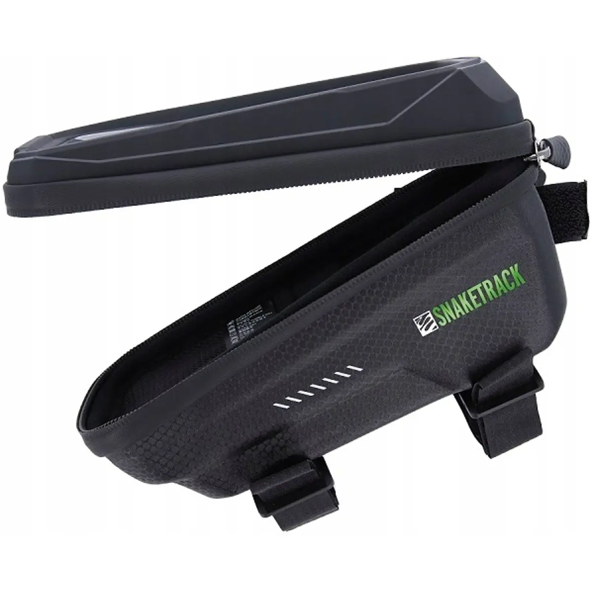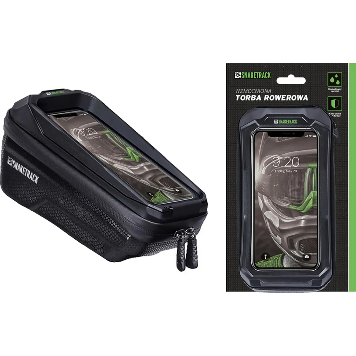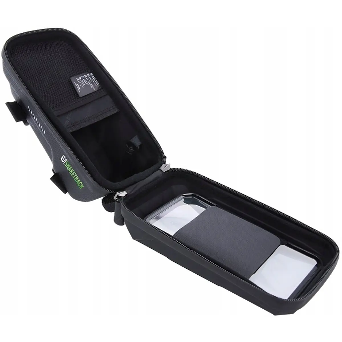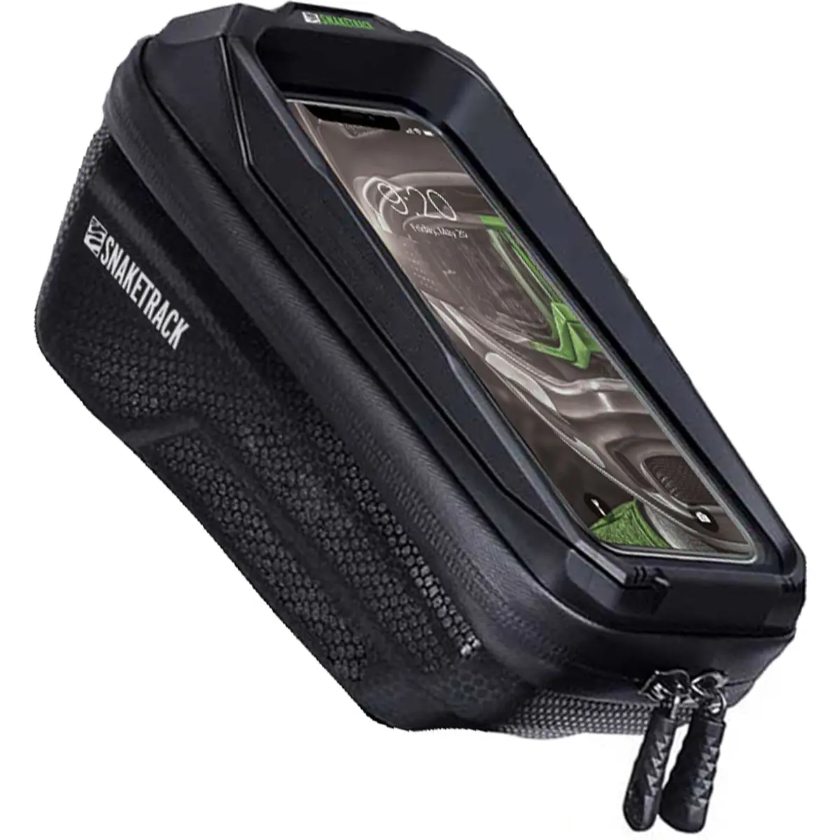 Bolsa Impermeável para Bicicleta Snake Track, uma solução eficaz e prática que permite a utilização conveniente do seu telefone ou sistema de navegação enquanto pedala, mesmo sob condições climáticas adversas. Com um design robusto e reforçado em "hard-shell" e uma generosa capacidade de 1,2 litros, esta bolsa oferece segurança para transportar consigo pequenos itens essenciais, como chaves, ferramentas, carteira, telefone, fecho de bicicleta, além de espaço adicional para uma bebida ou sanduíche compacto. O reforço adicional ao redor do compartimento do telefone assegura a proteção do dispositivo em caso de quedas.