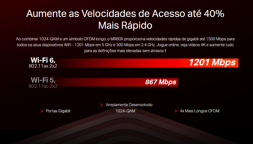 - Actualize a Sua Rede com Wi-Fi 6 - O MR60X está equipado com a mais recente norma Wi-Fi 6, que permite mais ligações simultâneas, aumenta o alcance do Wi-Fi e mantém transmissões de dados rápidas e fiáveis.