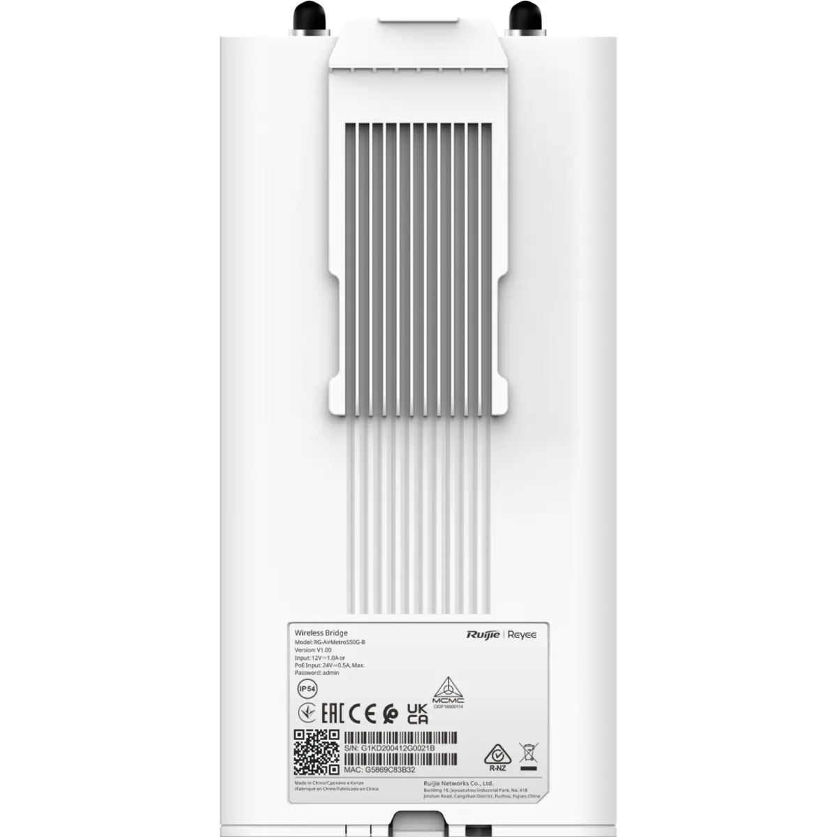 O RG-AirMetro550G-B é uma estação base da série RG-AirMetro de pontes wireless da Ruijie Reyee. Este dispositivo é projetado para aplicações em redes WISP (Wireless Internet Service Provider), sistemas de CCTV (Circuito Fechado de Televisão), vias urbanas, fábricas, entre outros. Ele suporta até 32 conexões PTMP (Point-to-Multi-Point) e oferece uma taxa de transferência máxima de 867 Mbps na banda de 5 GHz, utilizando a tecnologia IEEE 802.11ac.