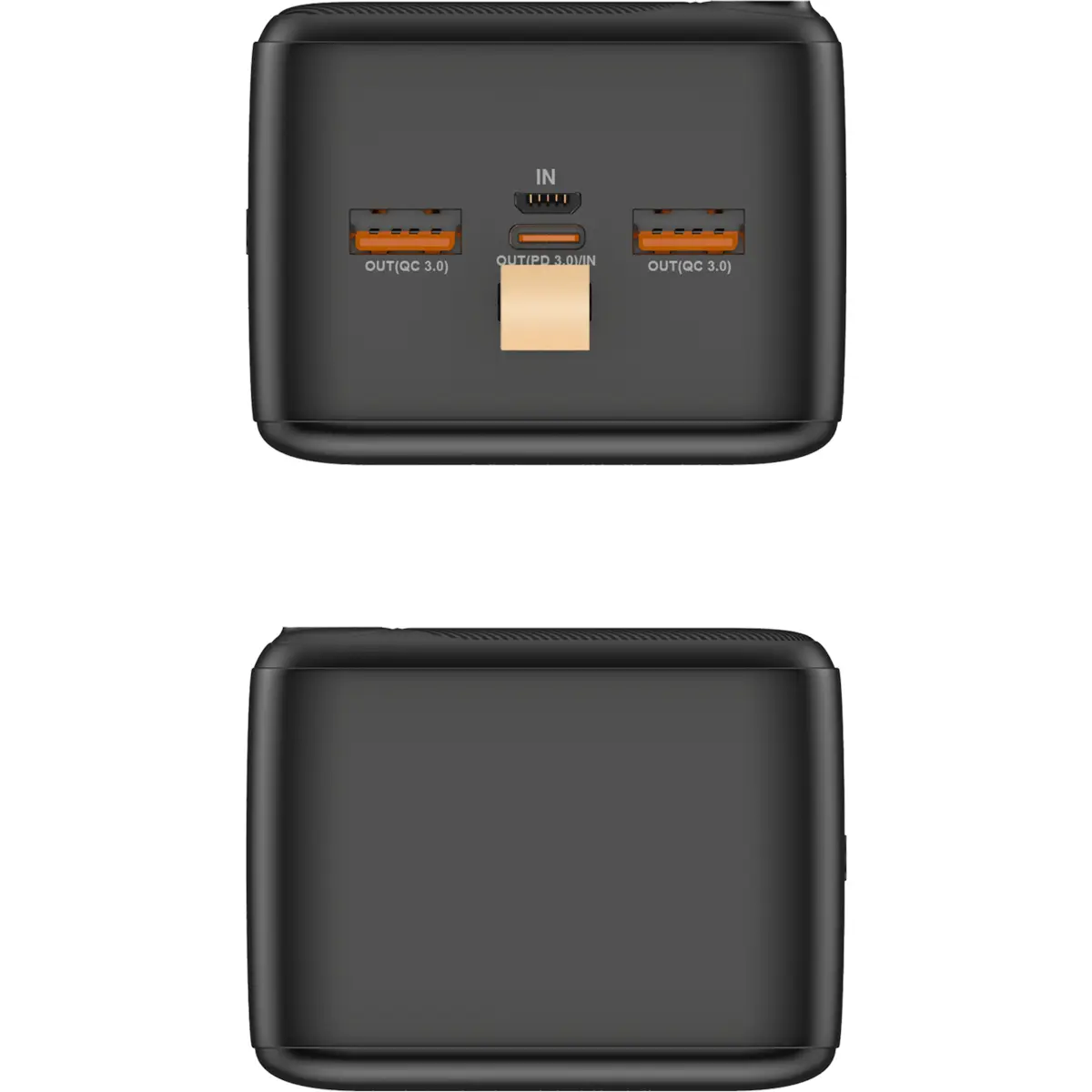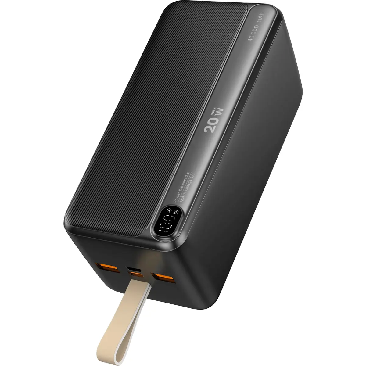 Bateria externa de elevada capacidade com 40000 mAh, Li-Ion, carrega dispositivos através de USB-C PD 3.0 e Quick Charge 3.0 com duas saídas USB-A. Possui ecrã LCD que mostra o estado de carga, deteção automática de ligação e proteções contra sobretensão, sobrecarga e descarga profunda. Inclui cabo USB-C, dimensões compactas (155 x 68 x 53 mm) e peso de 788 g, tornando-a ideal para viagens e uso diário.