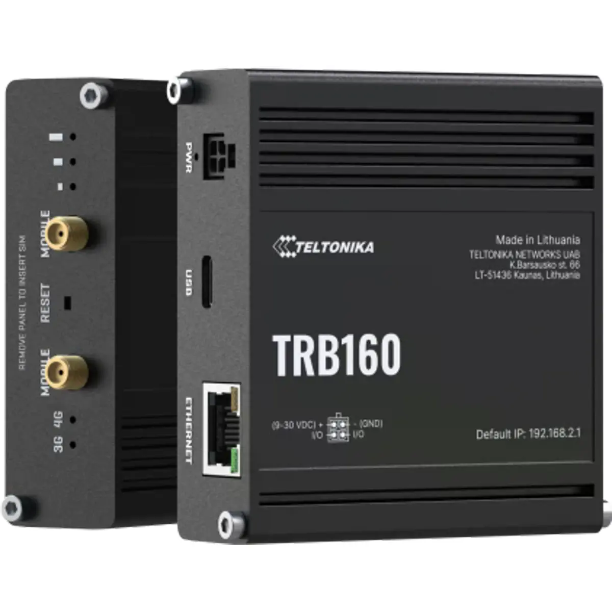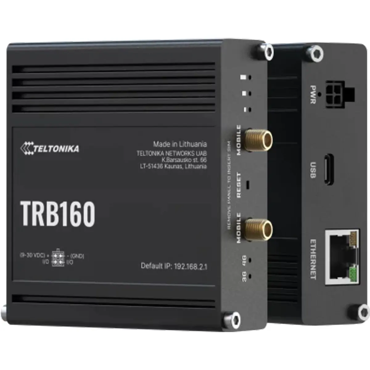 O TRB160 é um gateway IoT ultra-pequeno, leve, eficiente (em termos de energia) e vem equipado com: LTE Cat 6 de missão crítica, Ethernet Gigabit e uma interface de rede virtual através de USB Type-C, para fornecimento simultâneo de energia e dados de rede. Este gateway IoT pode atingir velocidades celulares de até 300 Mbps com agregação de portadoras em uma ampla gama de aplicações e suporta uma vasta gama de protocolos de nível industrial para comunicação M2M.