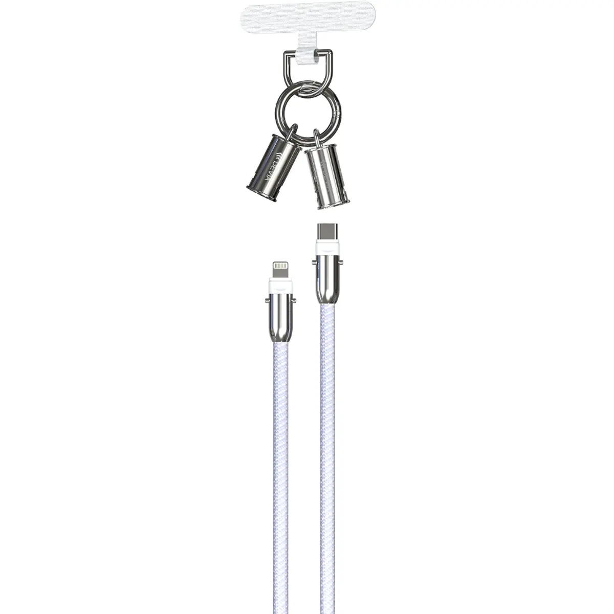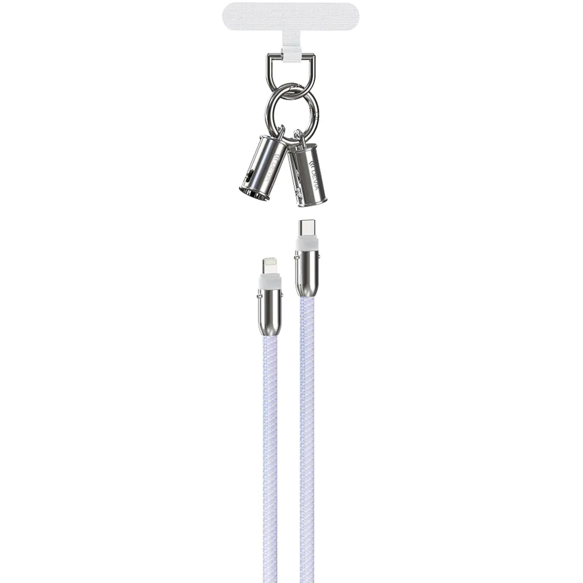 Este cabo 2-em-1 USB-C e Lightning PD de 27 W permite carregar ou transferir dados com até 3 A. Possui fivela de encaixe que transforma o cabo num lanyard com mosquetão, mantendo-o seguro mesmo em movimento. A construção em malha de nylon oferece durabilidade e resistência a emaranhamentos. Compatível com iPhones até ao iPhone 14, oferece carregamento estável, atualizações automáticas e um comprimento de 1,2 m. Disponível nas cores preto e roxo, com clipe de suspensão em forma de T para maior firmeza.