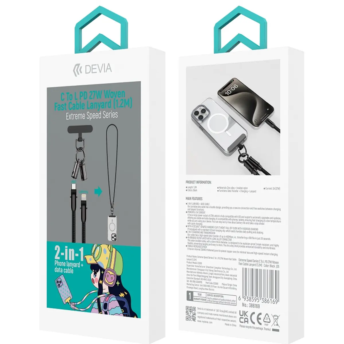Devia - Cabo colar (lanyard) de suporte de telemóvel 2-em-1 USB-C ⇿ Lightning PD 27W - Rosa - 1.2m