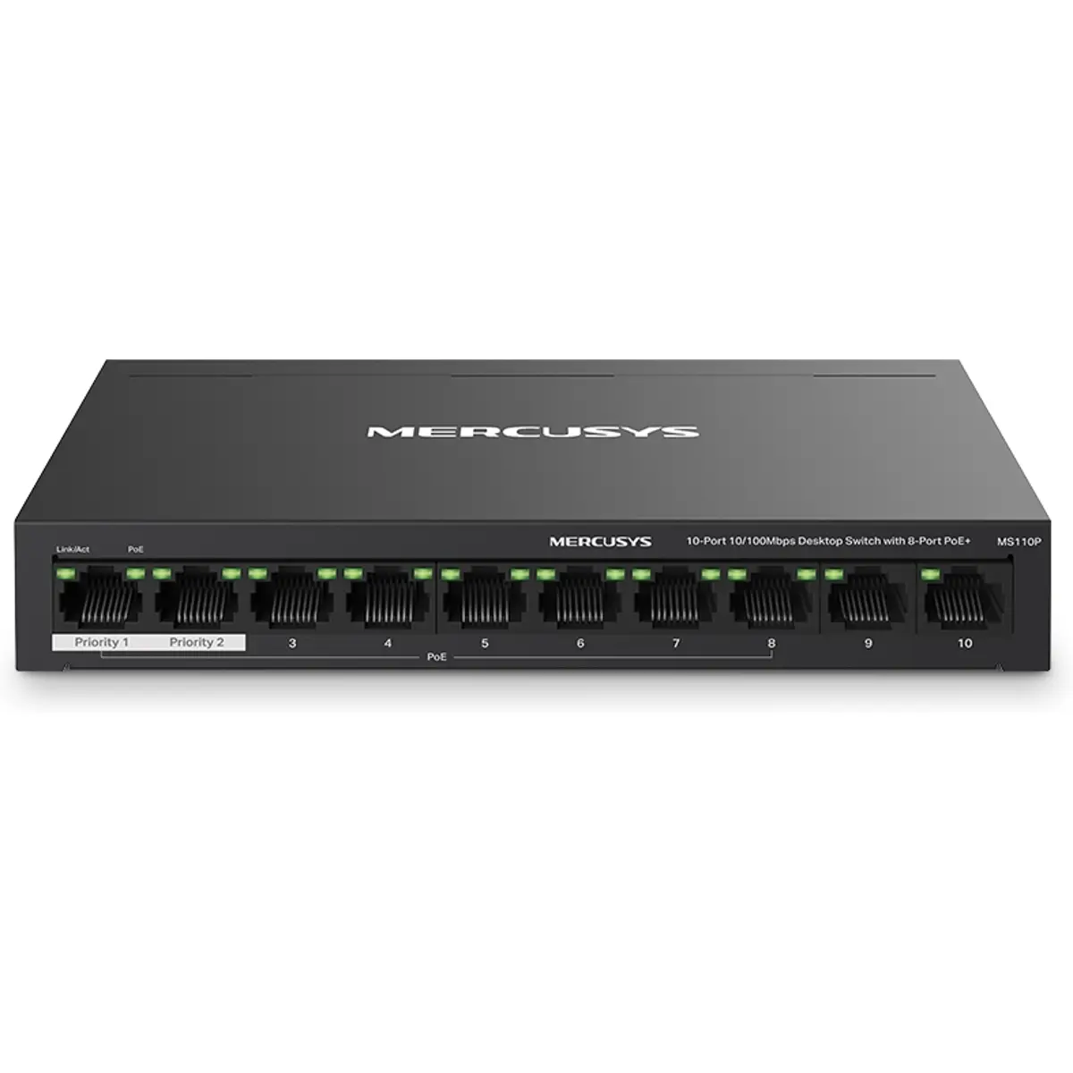 O MS110P é um switch desktop de 10 portas 10/100Mbps com 8 portas PoE+, ideal para redes que exigem eficiência e flexibilidade. Com transmissão de dados e energia em um único cabo, suporta até 30W por porta e um total de 65W PoE, perfeito para alimentar câmaras IP, telefones IP e outros dispositivos PoE. Oferece alcance estendido até 250m, modo de isolamento e priorização de portas para segurança e qualidade de comunicação, e recuperação automática PoE para reiniciar dispositivos que deixem de responder. De fácil instalação plug and play, possui uma estrutura metálica durável que facilita a dissipação de calor e garante uma longa vida útil, sendo ideal para escritórios e pequenas empresas.
