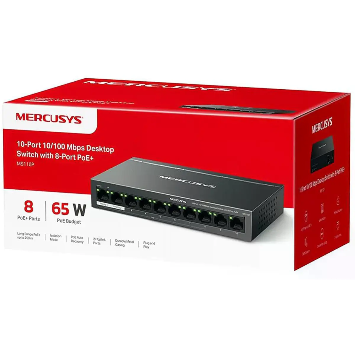 Portas 1-8 puportam PoE+, e cada uma delas suporta um máximo de 30 W e está em conformidade com a norma 802.3af/at nos equipamentos de rede com PoE Ativo. O MS110P fornece 2 portas sem PoE+ para equipamentos de ligação em uplink, uma das quais é utilizada para ligar à Internet e a outra para ligar ao NVR. O budget total é de 65 W de potência PoE*; portas PoE+ permite uma variedade de utilizações, incluindo vigilância para escritórios, dormitórios e pequenas empresas. Câmaras IP, pontos de acesso, telefones IP, PCs, gravadores de vídeo e muito mais são totalmente compatíveis com a norma.