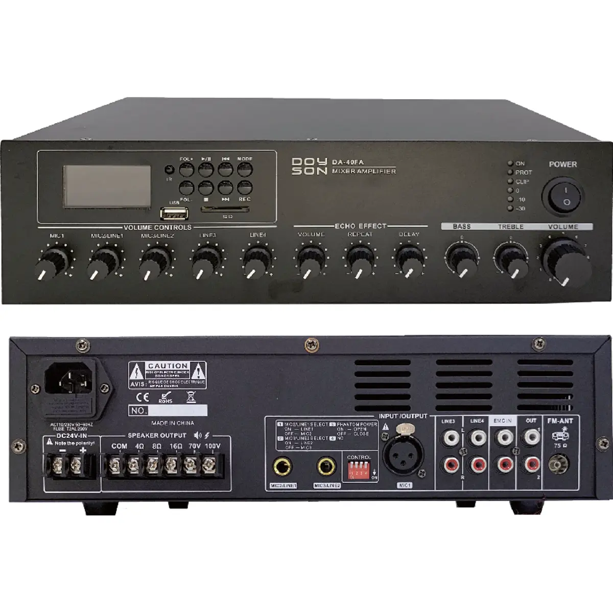 Amplificador misturador de som, com uma potência de saída de 40W, é a solução ideal para instalações de média a pequena escala, como escolas, supermercados, bancos e outros espaços comerciais. É perfeito para a reprodução de música ambiente e avisos de voz, oferecendo uma excelente relação qualidade-preço e facilidade de uso.