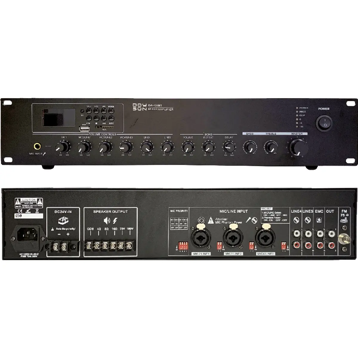 Doyson DA-120BT - Amplificador / Misturador 120W (100V/70V/4Ω/8Ω/16Ω) com Bluetooth, USB, SD, FM