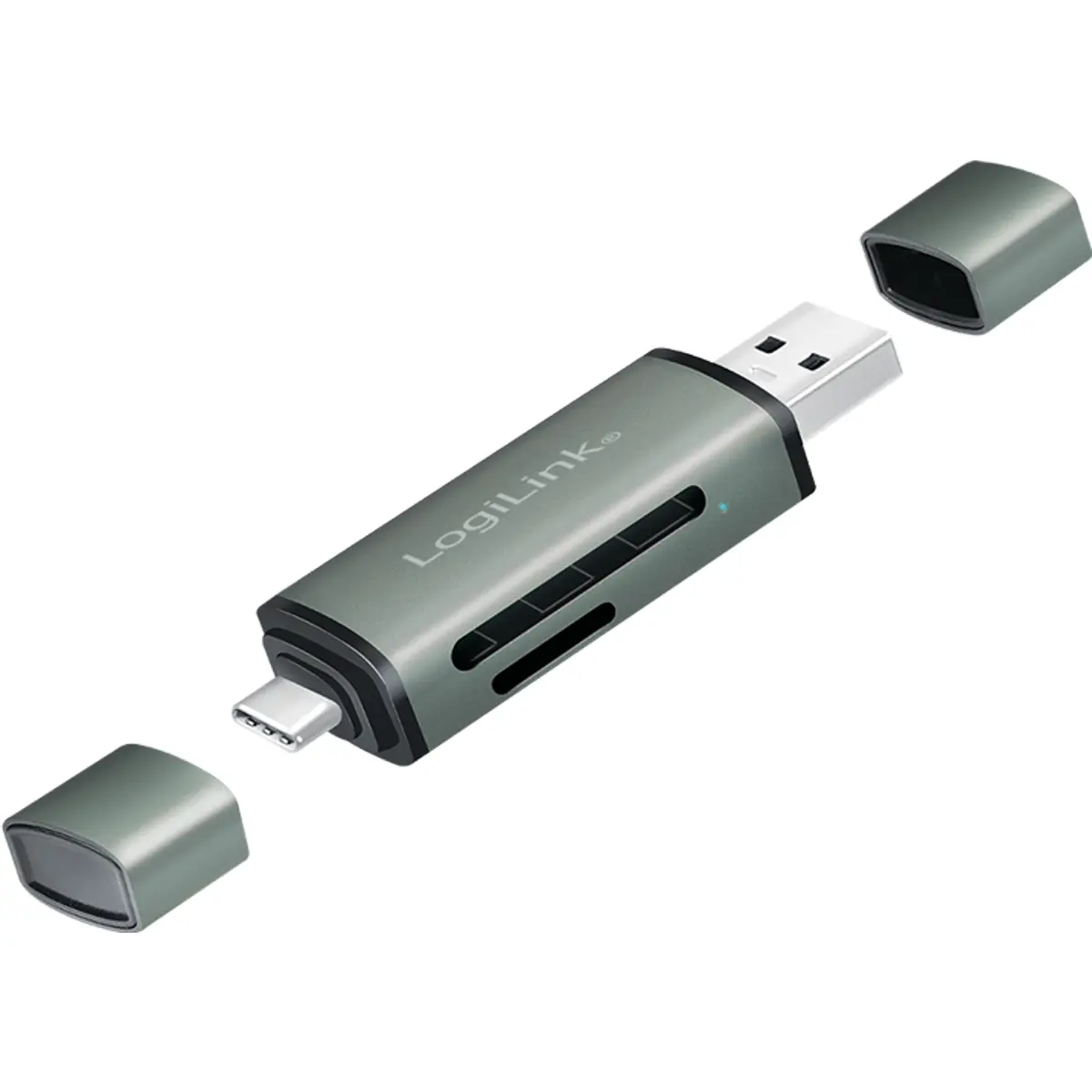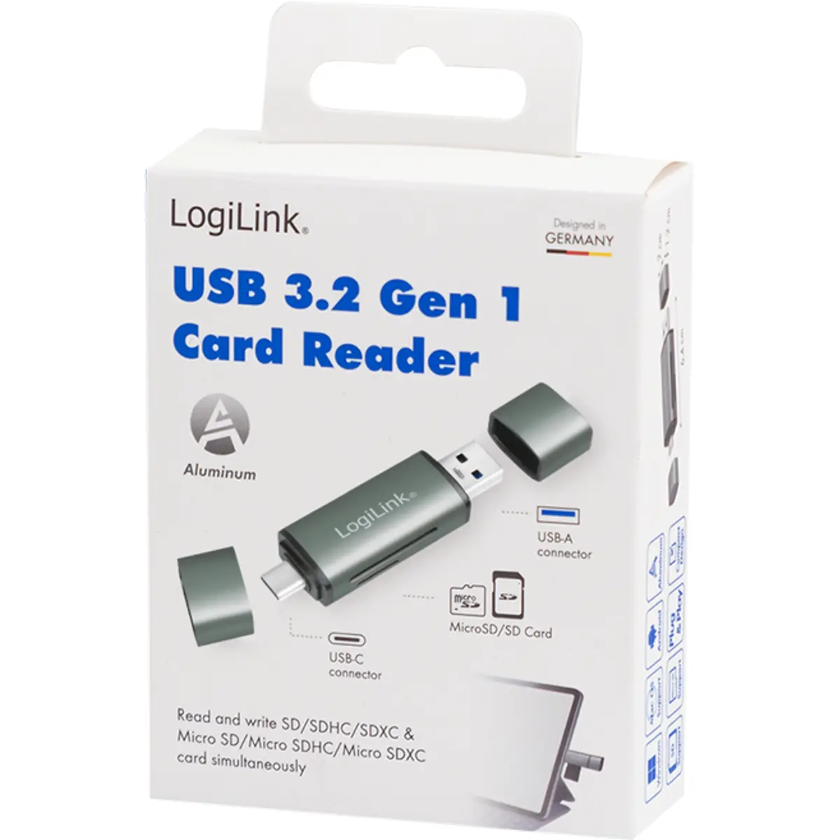 O leitor de cartões USB 3.2 Gen1 permite ler e transferir ficheiros de cartões SD e microSD para computadores, tablets ou smartphones com suporte OTG, através de ligações USB-A e USB-C. Suporta SD, SDHC, SDXC, microSD, microSDHC e microSDXC, com velocidades de até 5 Gbps, em formato plug-and-play sem necessidade de drivers. Estruturado em alumínio, compacto para viagem, suporta Hot Swap, é compatível com Android, Chrome OS, Mac OS, Windows e Linux, apresentando LED de atividade azul.