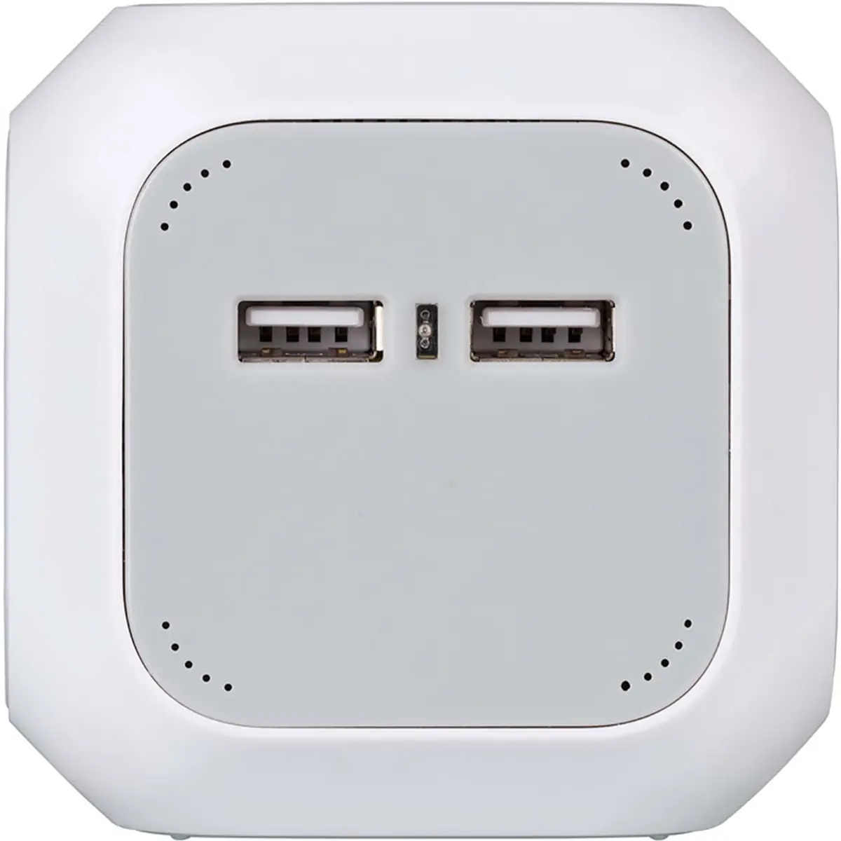 Extensão multifunção em formato cubo com quatro tomadas tipo Schuko e duas portas USB. Versátil para escritório e em viagem, oferece montagem fixa na mesa ou na parede, proteção contra toque acidental e um LED de funcionamento. Construção em policarbonato polido resistente, índice IP20 para uso interior e cabo de 1,4 m. Capacidade nominal de 16 A e potência até 3680 W a 230 V, com USB até 2,1 A por porta.