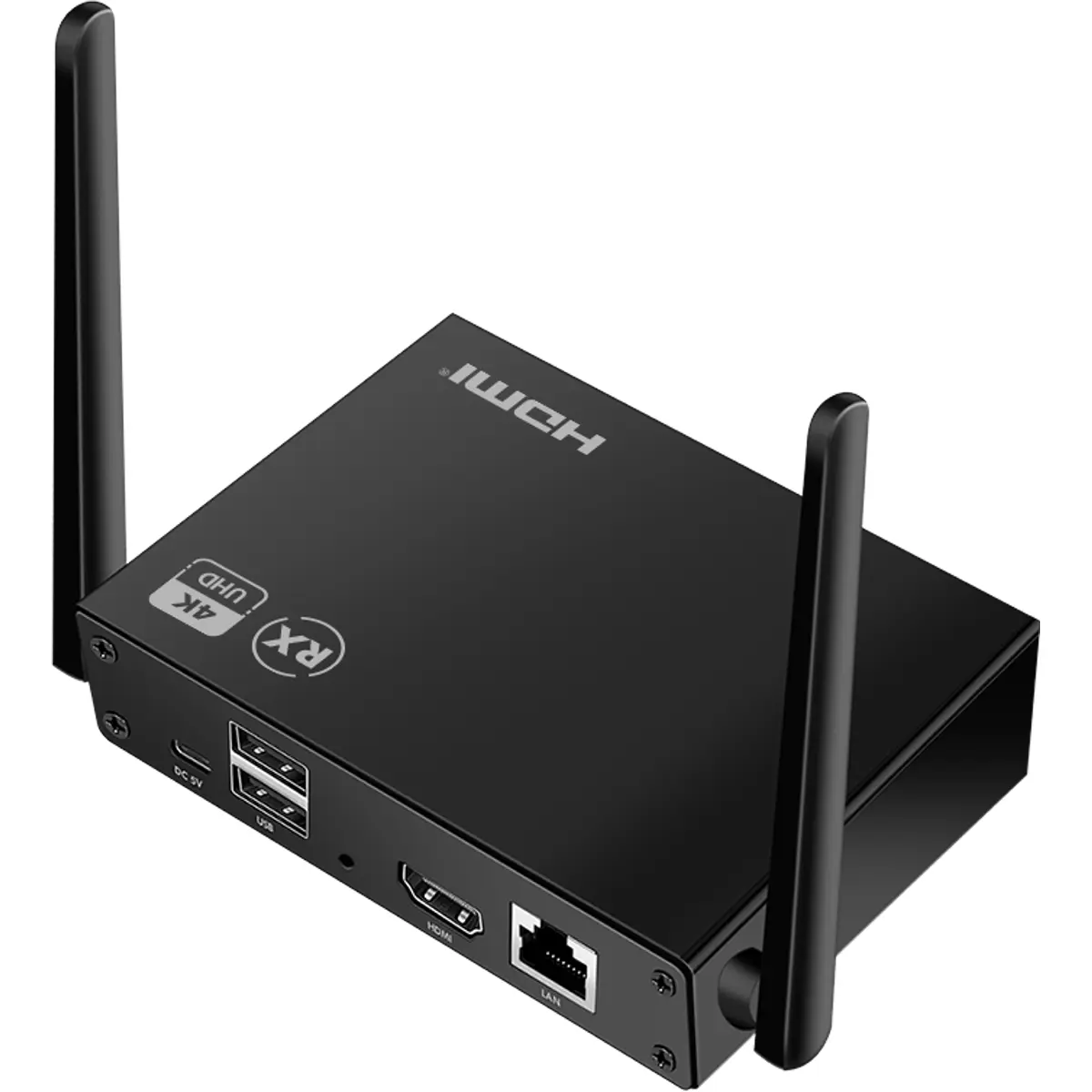 Este sistema de videoconferência sem fios all-in-one com dois transmissores e um receptor permite apresentações sem cabos em salas de reuniões e formação, com alcance de até 50 metros em condições ideais. Compatível com Microsoft Teams, Zoom e outras plataformas, suporta transmissão UHD 4K/60 Hz via HDMI 2.0, multicast para múltiplos receptores e áudio PCM estéreo. Inclui quadro branco integrado, plug-and-play sem drivers, chassis metálico, criptografia AES 128-bit com WPA2 e suporte USB-KVM; funciona em redes Wi‑Fi 2.4/5 GHz com 802.11ac.
