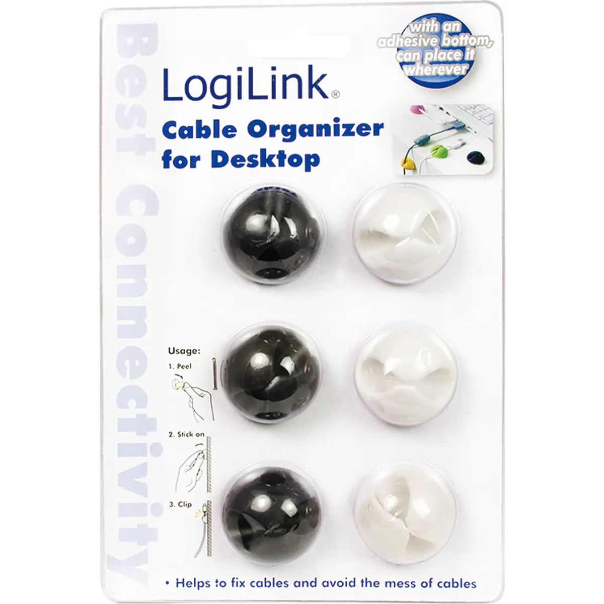 Suporte de cabos com fita adesivo da LogiLink para segurar cabos, canetas, auriculares, etc. Fácil de instalar: basta remover a película protetora da tira adesiva e fixar o suporte na posição desejada. O conjunto inclui seis suportes de cabos em duas cores (preto/branco).