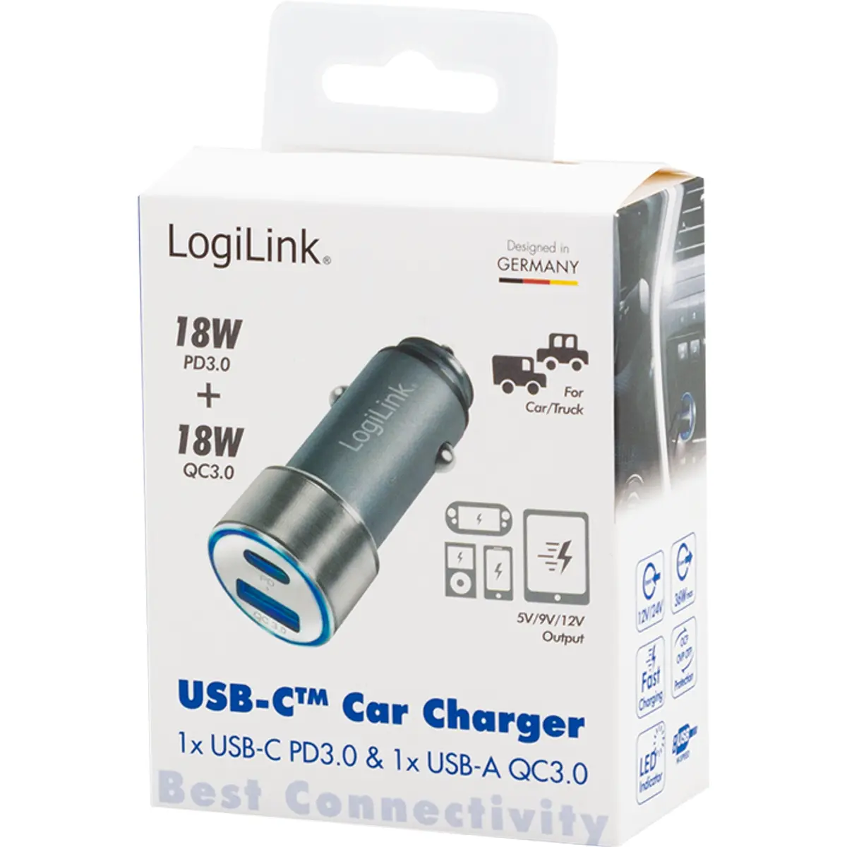 Logilink PA0252 - Carregador de Isqueiro (12..24VDC) USB-A QC 18W + USB-C PD 18W