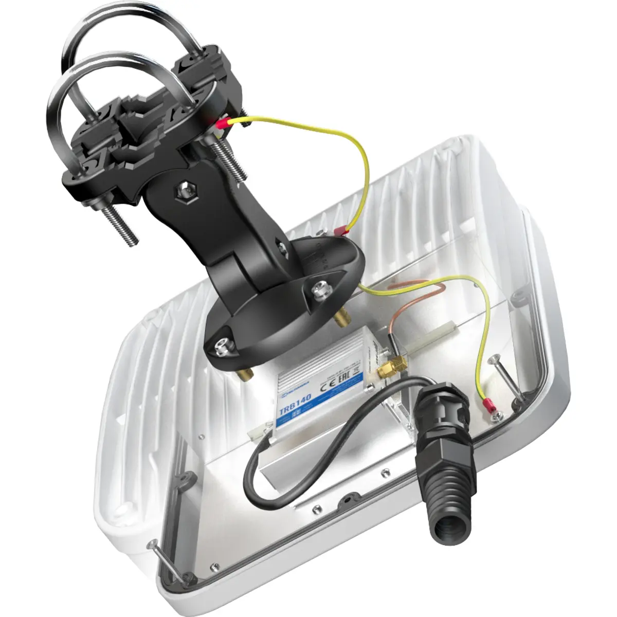 A antena e o router são integrados num único invólucro, permitindo que a antena funcione em quaisquer condições meteorológicas, graças à classificação IP67. A integração também reduz o comprimento do cabo, o que diminui a perda de sinal e melhora a qualidade. A antena é perfeitamente compatível com o TRB140 e também com os modelos TRB141, TRB142, TRB143 e TRB145.