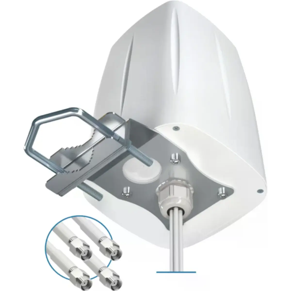 Esta versão da QuOmni 7V-4 (O7V.4RS) vem equipada com quatro cabos de antena LMR195 de 70 cm com conectores RP-SMA. Isto permite a ligação direta da antena ao router ou ponto de acesso, ficando pronta a funcionar.