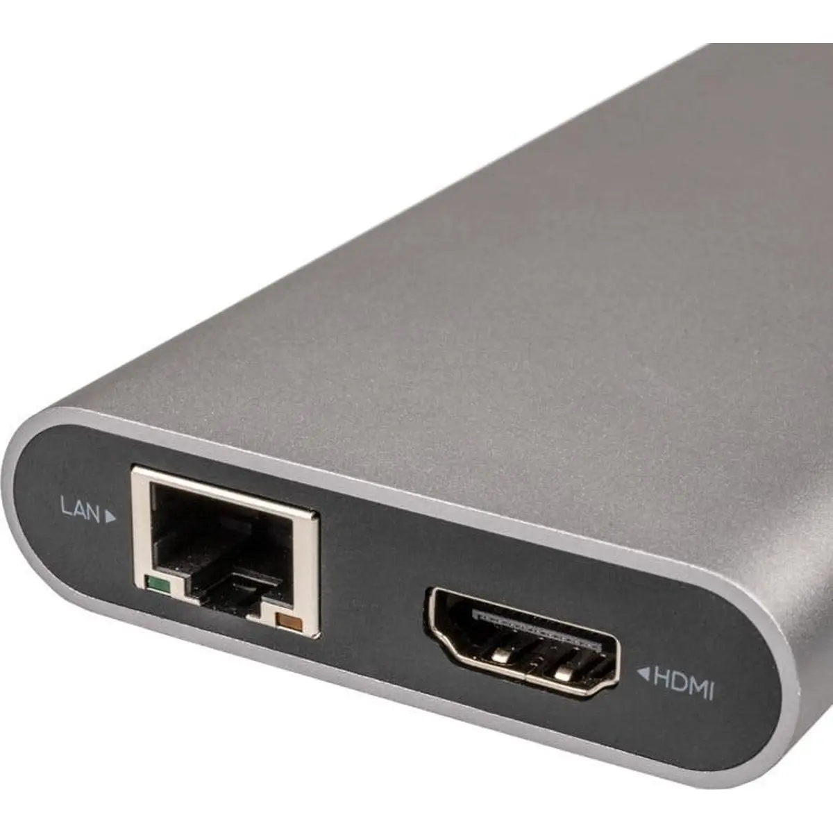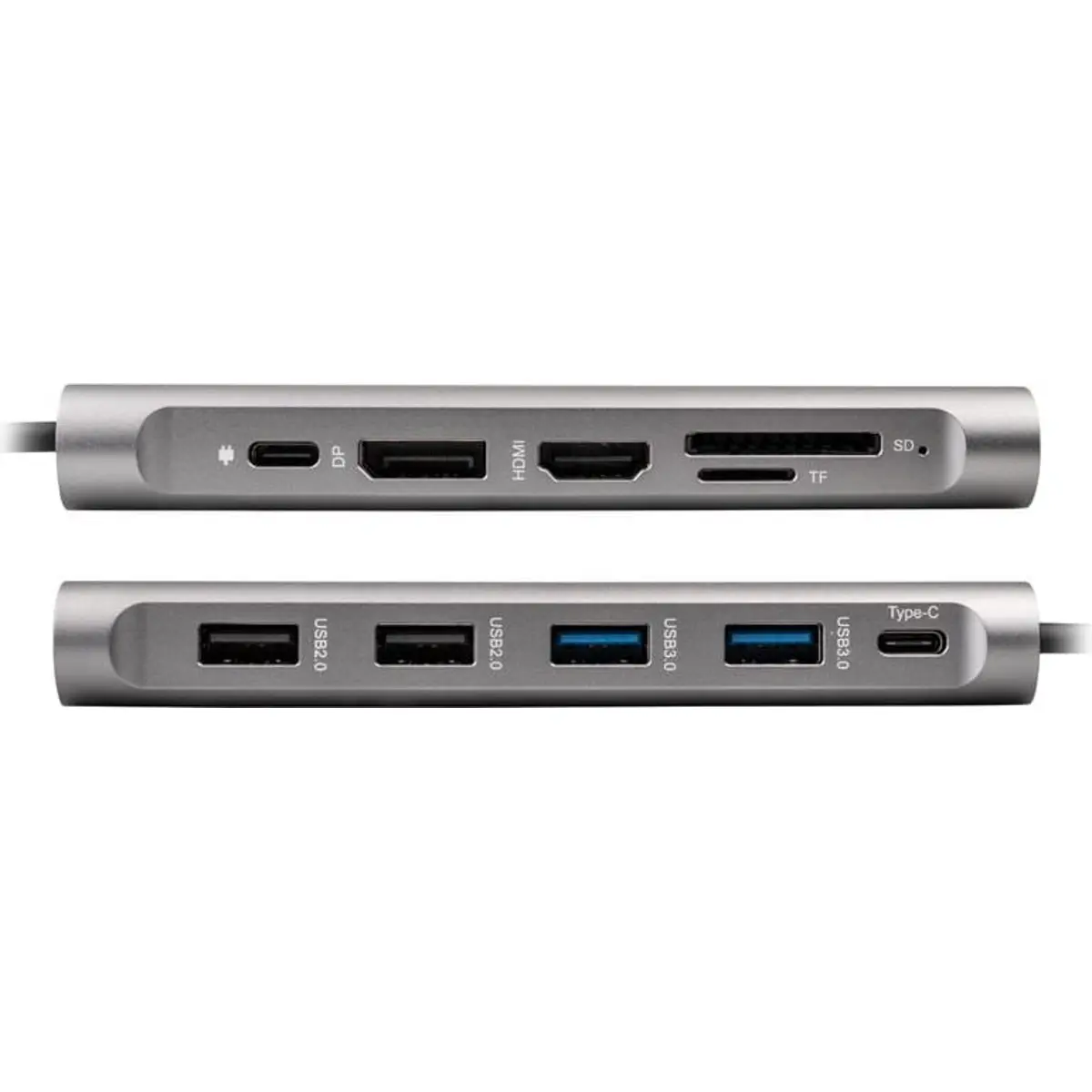 Estação docking USB-C 12-em-1, em alumínio, que expande significativamente a conectividade de portáteis. Suporta até três monitores (2x HDMI, 1x DisplayPort 1.4) com resolução até 3840x2160 a 60 Hz por porta. Oferece USB-C (dados) e USB 3.0/2.0, várias portas USB 3.0 Type-A, USB 2.0 Type-A, cartão SD/microSD 2.0 (até 25 MB/s) e Ethernet Gigabit. Carregamento via USB-C até 100 W sem transmissão de dados. Alimentação bus-powered e compatível com Windows 10; suporta Power Delivery e DisplayPort Alt Mode.