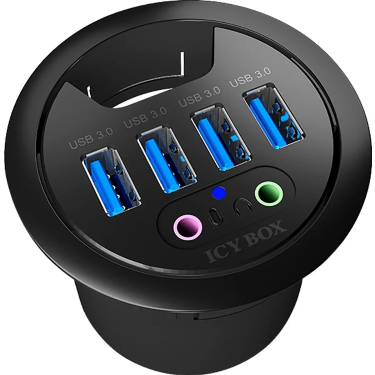O ICY BOX IB-HUB1403A é um hub USB de secretária concebido para ser instalado discretamente em orifícios de 60 mm, mantendo a organização do espaço de trabalho. Oferece quatro portas USB 3.0 Type-A e entradas/saídas de áudio acessíveis, ideais para ligação rápida de periféricos e auscultadores. Possui cabos integrados e suporta alimentação externa opcional.
