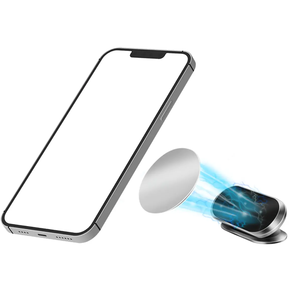 Este suporte magnético universal em alumínio para telemóvel fixa o dispositivo com força estável, permitindo rotação de 360° e ajuste de ângulo com uma mão. Adequado para carros, mesas, paredes ou escritórios, oferece fixação rápida através de placa metálica e íman e inclui duas placas magnéticas para facilitar a instalação. O design minimalista integra-se em qualquer ambiente, mantendo o telemóvel acessível e estável, com dispositivos até 800 g.