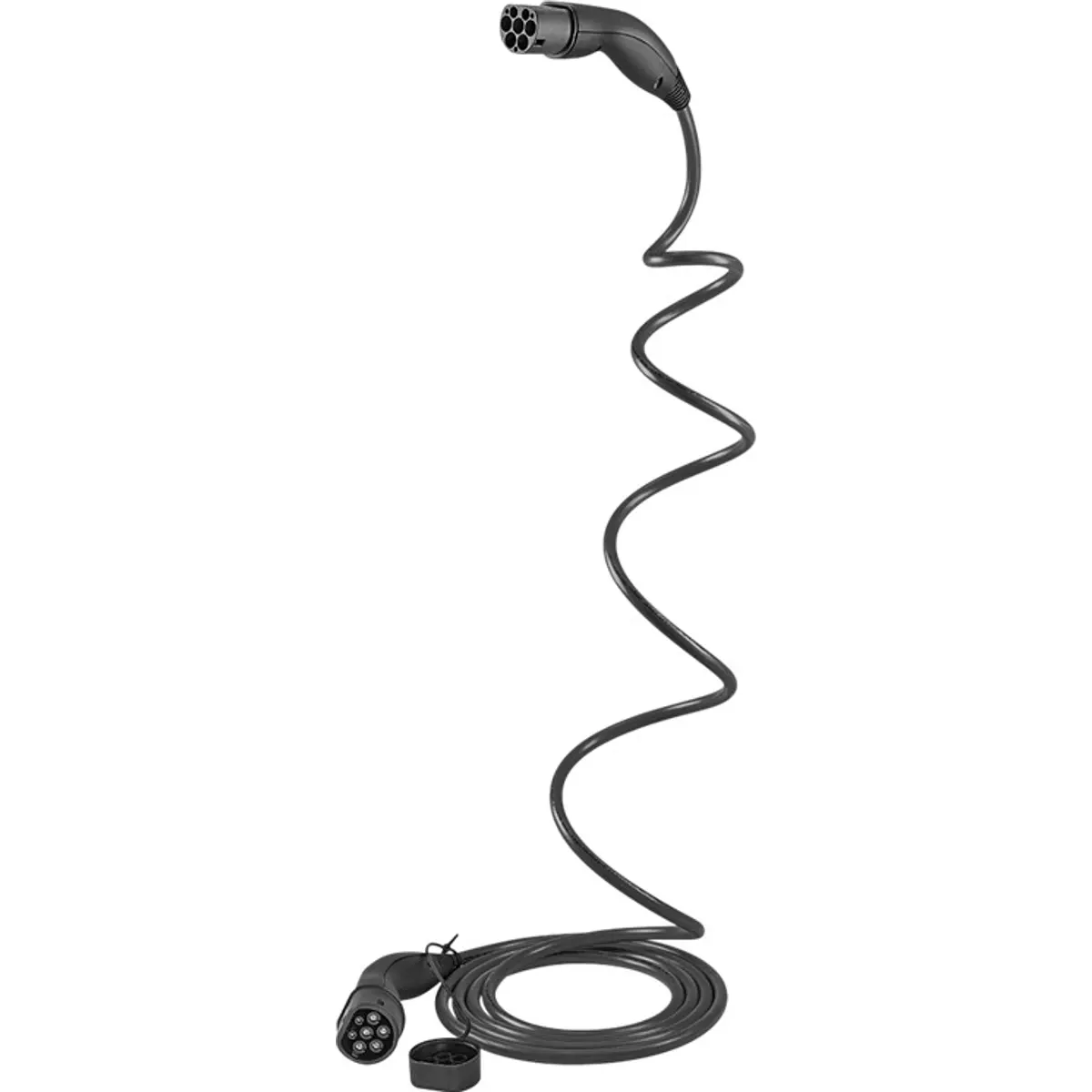 Cabo trifásico para carregamento de veículos elétricos, com 3 metros de comprimento, memória de forma (helicoidal), fichas de ligação do Tipo 2, corrente máxima de 32 A (por fase) e potência máxima de 22 kW.