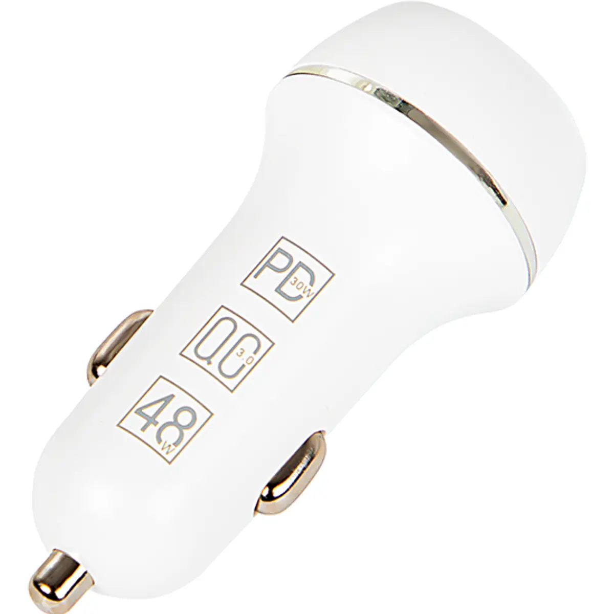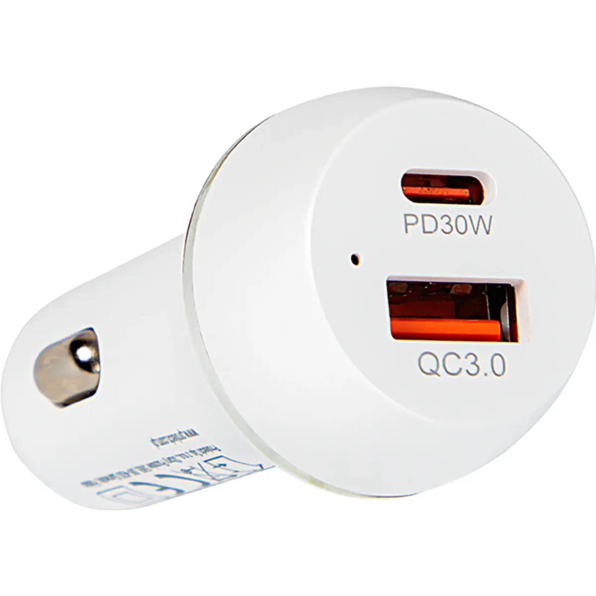 Carregador automóvel compacto com duas portas, USB-C PD30W e USB-A QC3.0, compatível com 12V e 24V, até 48W de potência total. Construção com materiais ecológicos e proteção contra sobretensão para maior segurança. Permite carregar dois dispositivos simultaneamente num espaço reduzido, com design moderno e funcional. Ideal para automóveis, desde carros a furgonetas, oferecendo carregamento rápido para smartphones, tablets e outros dispositivos USB.
