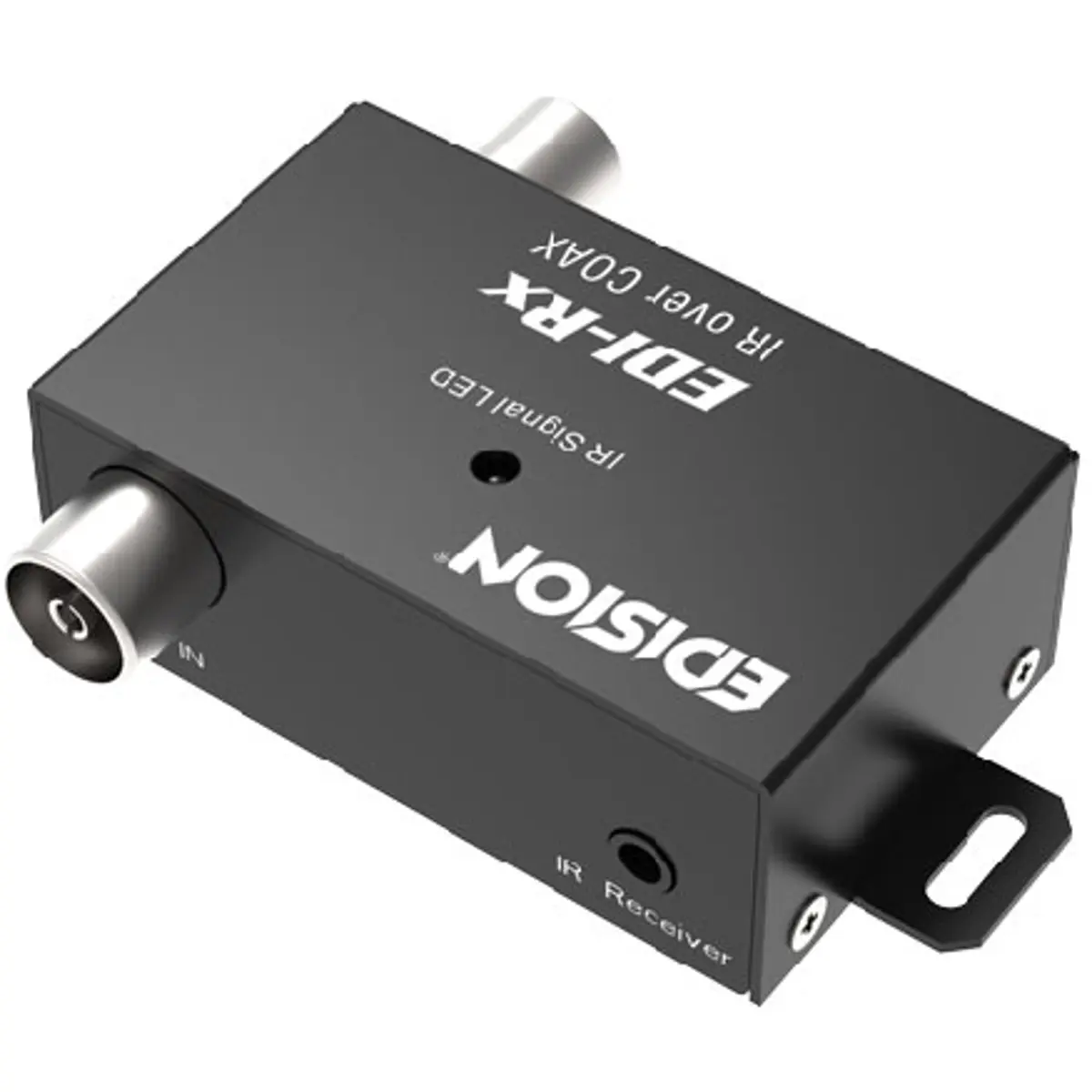 Recetor de infravermelhos para controlo remoto adicional via cabo coaxial, compatível com o kit de extensão IR EDI-TxRx, para comandar receptores de TV por satélite ou TDT a partir de um ponto adicional na instalação coaxial. Possui portas RF IN, RF OUT e IR OUT, alimentação DC 5V e indicador LED de sinal IR. Composto por dois módulos (sensor e processador IR), usa modulação ASK e funciona em VHF III (174–230 MHz) e UHF (470–862 MHz). Dimensões 7,8 x 5,8 x 2,8 cm; sensor preto.