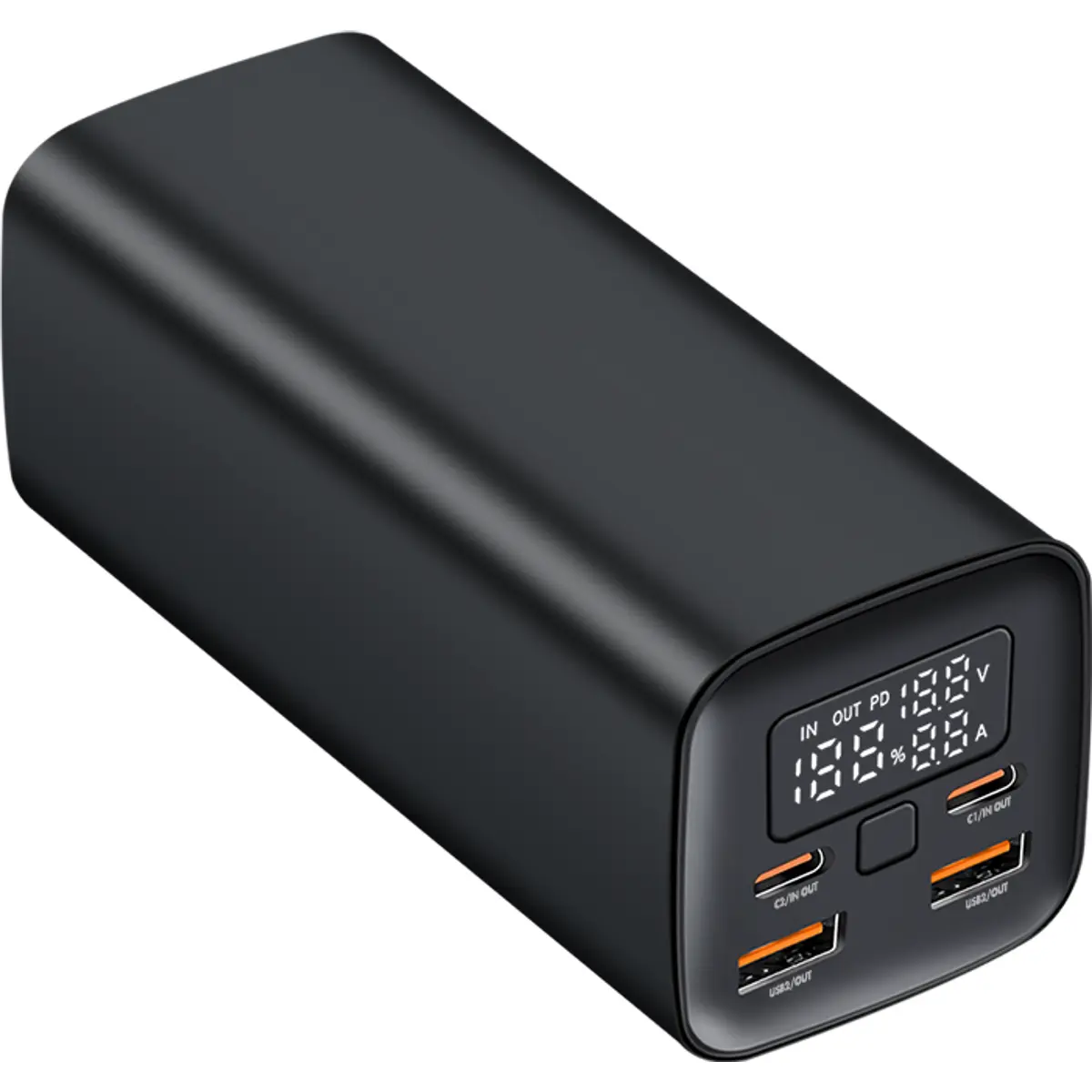 Powerbank de alta capacidade com ecrã LCD; oferece 20.000 mAh (74 Wh) de energia. Suporta carregamento bidirecional rápido até 65 W, com duas portas USB-C (até 65 W cada) e duas USB-A (até 22,5 W cada), total até 90 W, e PPS (3.3-11V/5A). Possui proteções contra sobrecarga, sobretensão, sobrecorrente, curto-circuito e sobreaquecimento. Corpo em plástico preto, compacto (10,5 x 4,8 x 4,8 cm) e peso 390,5 g, com cabo de 30 cm incluído.