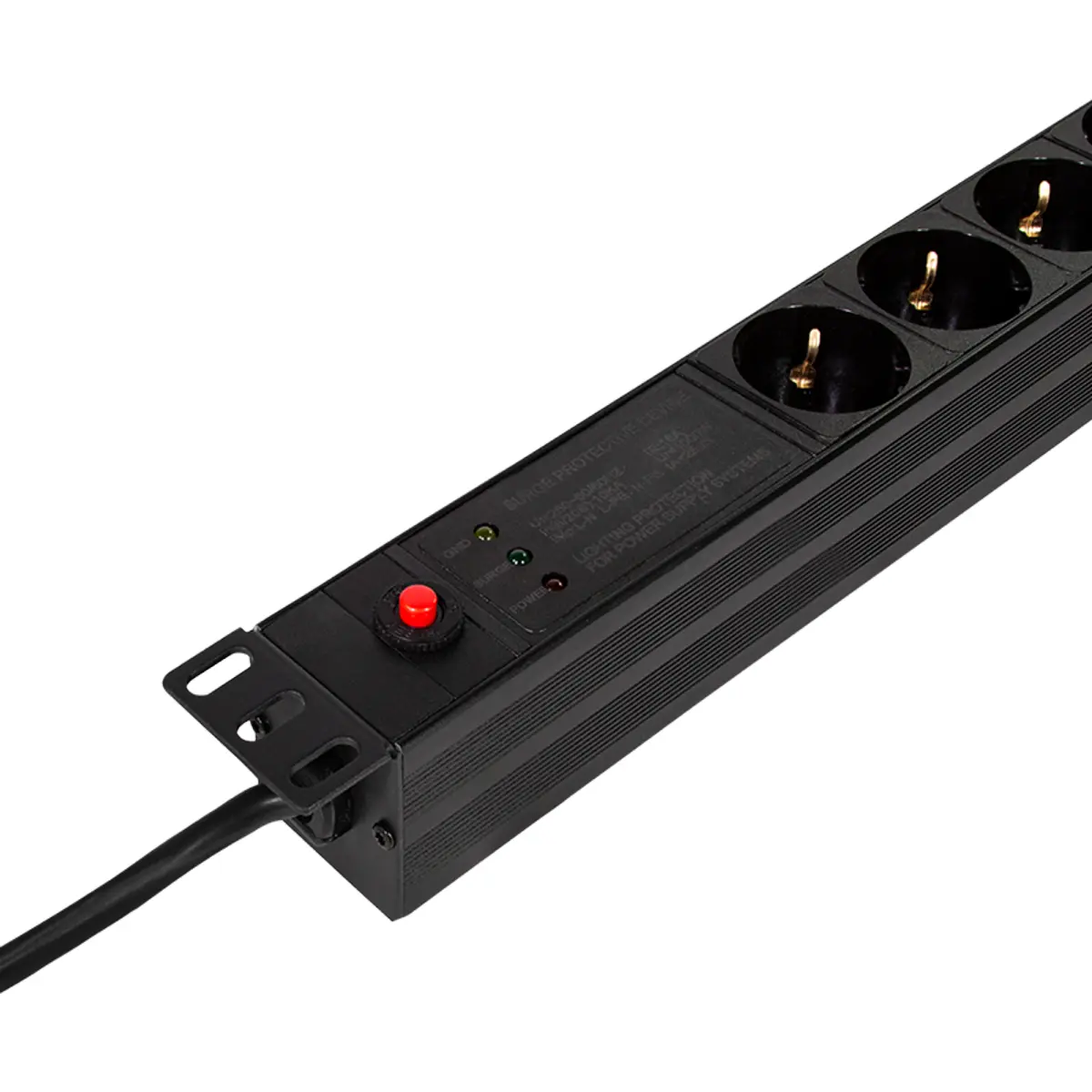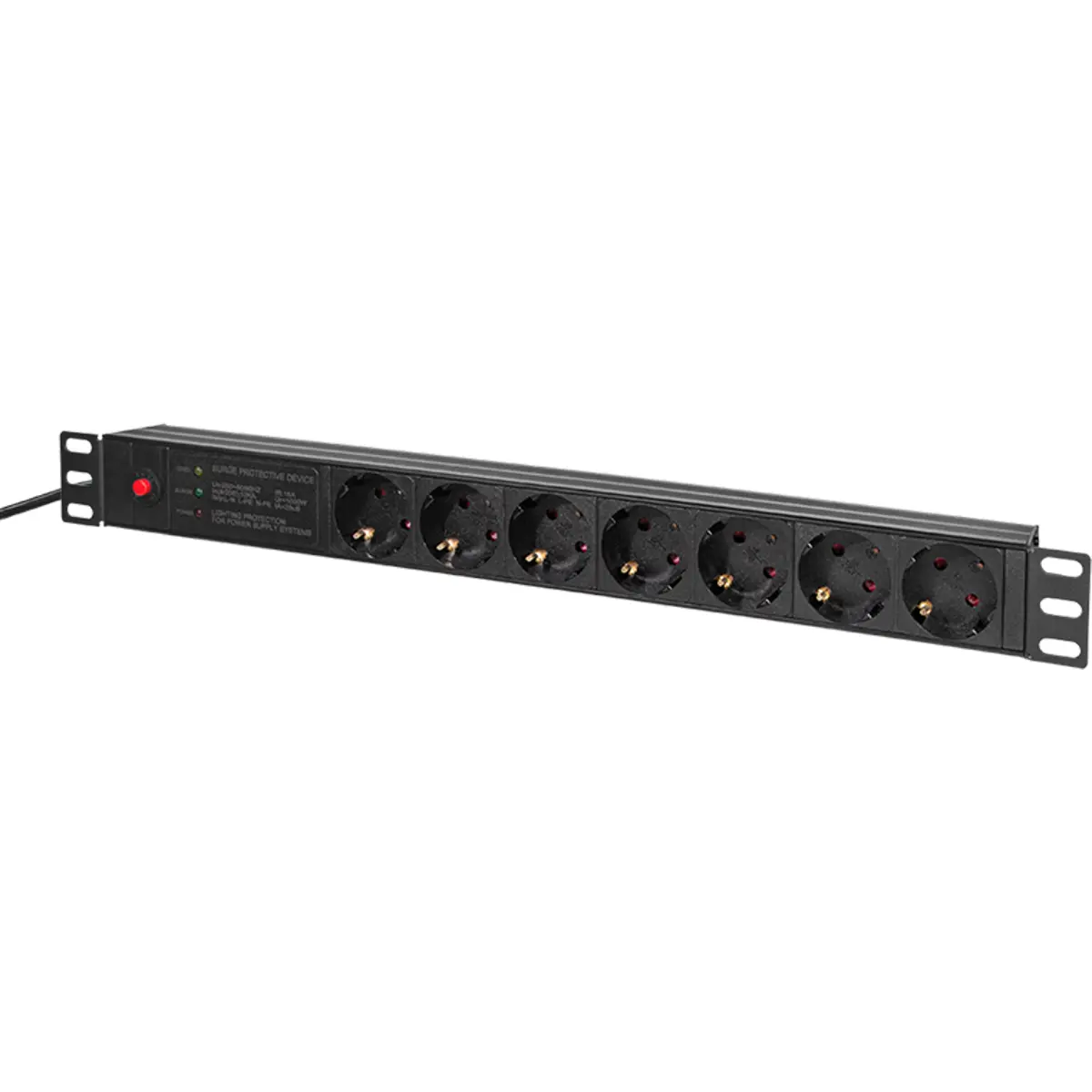 Régua de distribuição de energia para rack 19'' 1U com 7 tomadas Schuko a 45°, proteção contra sobretensão com filtragem e proteção contra sobrecarga. Cabo de ligação de 2 m com ficha angular CEE 7/7, estrutura em alumínio com IP20. Tensão nominal de 230 V AC, frequência 50 Hz, corrente 16 A e potência máxima de 3600 W. Adequada para centros de dados, servidores e sistemas de telecomunicações, oferecendo fiabilidade em ambientes exigentes e segurança eléctrica, com proteções integradas e compatibilidade com bastidores 19''.