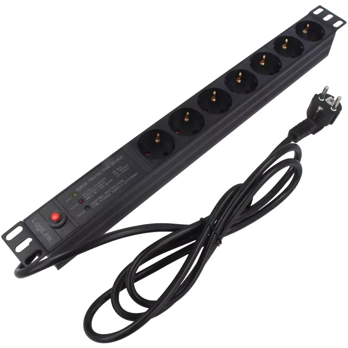 Logilink PDU7C02 - Bloco PDU de 7 tomadas para rack bastidor 19'' 1U c/ múltiplas proteções e ficha schuko