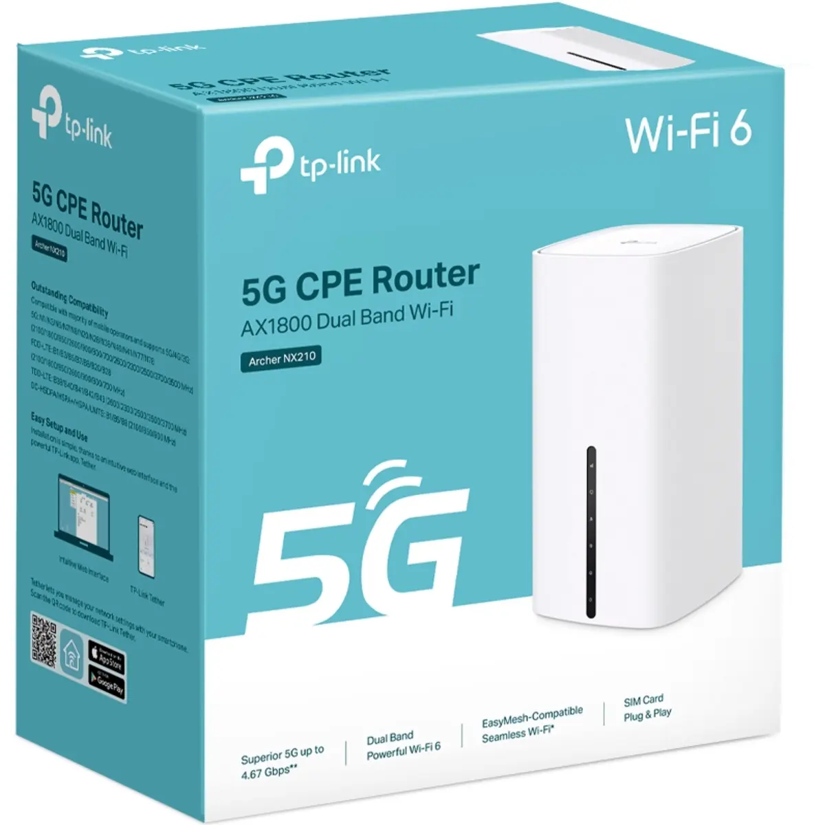 O TP-Link Archer NX210 é um router 5G Dual Band com tecnologia Wi-Fi 6, concebido para oferecer velocidades ultrarrápidas e uma ligação fiável para casas e pequenos escritórios. Com suporte para redes 5G com downloads até 4,67 Gbps, garante streaming em 4K/8K, videoconferências e jogos online sem interrupções. O NX210 integra tecnologia Wi-Fi 6 (802.11ax), proporcionando maior capacidade de rede, eficiência e cobertura, permitindo que múltiplos dispositivos se liguem simultaneamente sem perda de desempenho.