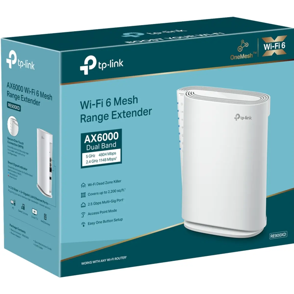 O TP‑Link RE900XD é um extensor de sinal Wi‑Fi 6 com tecnologia AX6000, projetado para ampliar e reforçar a cobertura Wi‑Fi em residências ou pequenos escritórios. Compatível com o protocolo EasyMesh, funciona com routers compatíveis para oferecer sinal contínuo e desempenho fluído. Ideal para quem procura melhorar a recepção em áreas com sinal fraco, o RE900XD traz velocidades de até 6 Gbps, portas de rede Multi-Gig e flexibilidade de instalação, tanto em mesa como na parede.