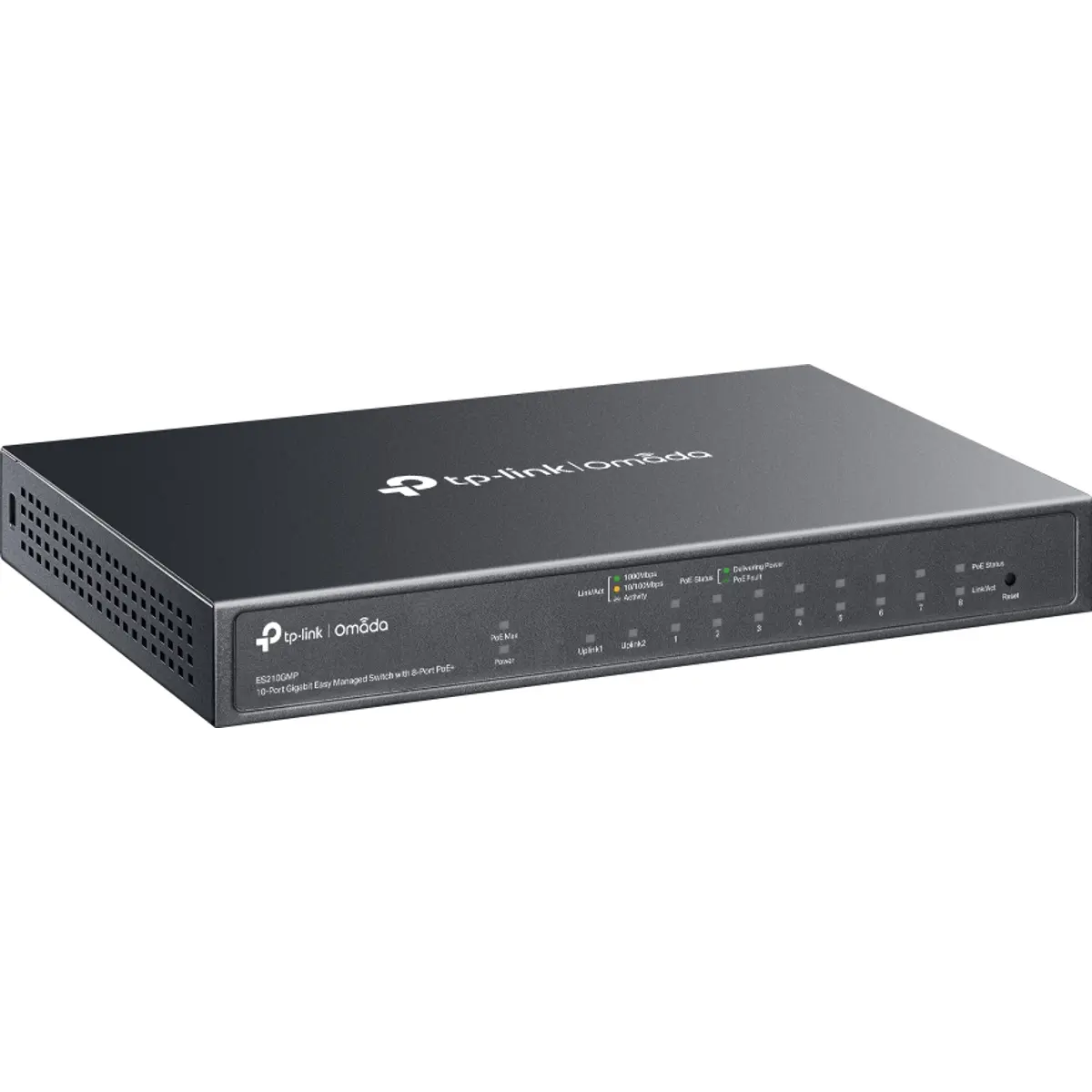 O TP-Link Omada ES210GMP é um switch gerenciável compacto e potente, ideal para pequenas empresas, espaços comerciais ou redes de videovigilância. Com 10 portas Gigabit, das quais 8 suportam PoE+ (802.3af/at), fornece até 30 W por porta e PoE de 123 W, permitindo alimentar pontos de acesso, câmaras IP ou telefones VoIP sem necessidade de fontes de alimentação adicionais. O ES210GMP oferece uma capacidade de comutação de 20 Gbps, taxa de encaminhamento de 14,88 milhões de pacotes por segundo (Mpps), suporte para Jumbo Frames até 15 KB, buffer de pacotes de 4 Mbit e tabela MAC para até 8.000 endereços, assegurando uma operação fluida mesmo sob carga elevada.