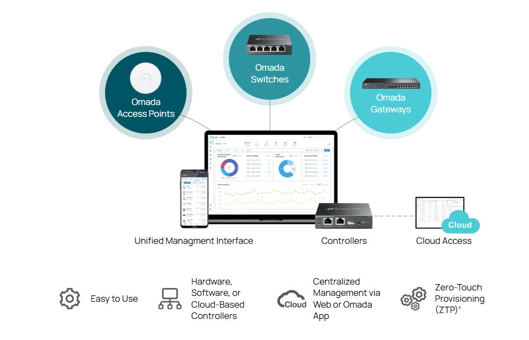 ✅ Controlo através da gestão centralizada via Omada SDN, suportada via cloud, hardware ou software.