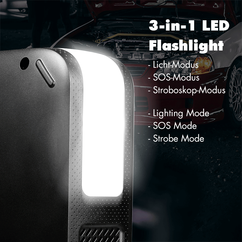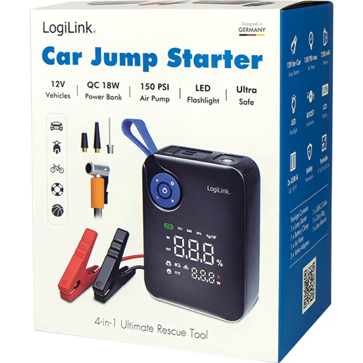 O jump starter 4-em-1 da LogiLink é uma ferramenta de emergência versátil para viagens, combinando arranque portátil, compressor de ar, lanterna LED e power bank com duas portas USB. O design compacto e a bolsa de transporte incluída permitem guardar facilmente no carro. Equipado com múltiplas funções de proteção, como contra curto-circuito, descarga excessiva e polaridade invertida, garante segurança máxima. O grande ecrã LCD indica o estado da bateria, pressão exata, modo de enchimento e estado de carregamento.