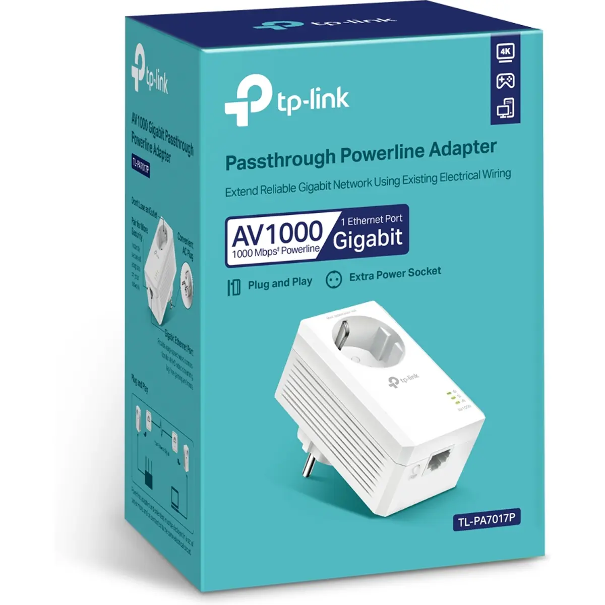 O TL‑PA7017P é um adaptador Powerline gigabit individual, com tecnologia HomePlug AV2 para transmitir dados através da instalação elétrica. Com velocidades até 1 000 Mbps, é ideal para ligações com fio de dispositivos como computadores, TVs ou consolas. A porta Ethernet gigabit assegura uma ligação estável e rápida, enquanto a tomada elétrica integrada (suporta cargas até 16 A) permite ligar outros aparelhos sem perder o acesso à ficha de parede. Este modelo é plug‑and‑play, não requer configuração, e inclui modo de poupança de energia automática, reduzindo o consumo até 85 %.